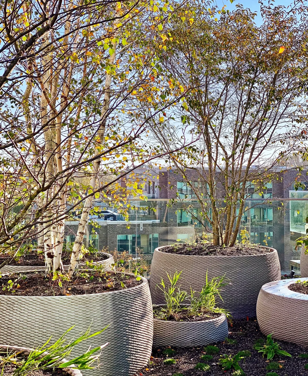 An inventive roof structure, consisting of a basic substrate layer and 3D printed pots for trees and shrubs, creates a uniform structure for all terraces and ensures good growing conditions for the greenery.