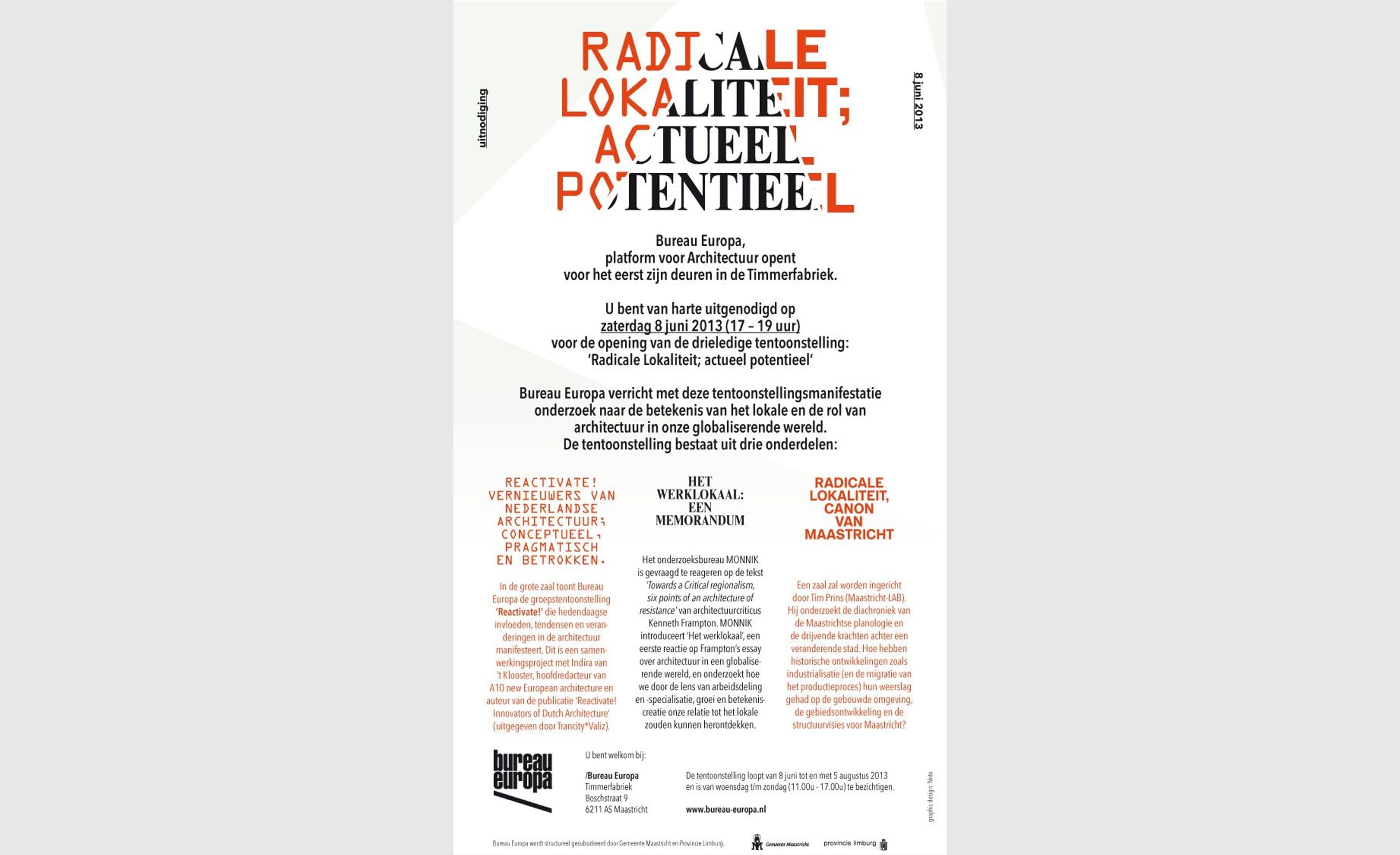 Bureau Europa opent voor het eerst zijn deuren in de Timmerfabriek. U bent van harte uitgenodigd op zaterdag 8 juni 2013 (17 – 19 uur) voor de opening van de tentoonstellingsmanifestatie. Van 8 juni t/m 5 augustus onderzoekt Bureau Europa de betekenis van het lokale en de rol van architectuur in onze globaliserende wereld.
