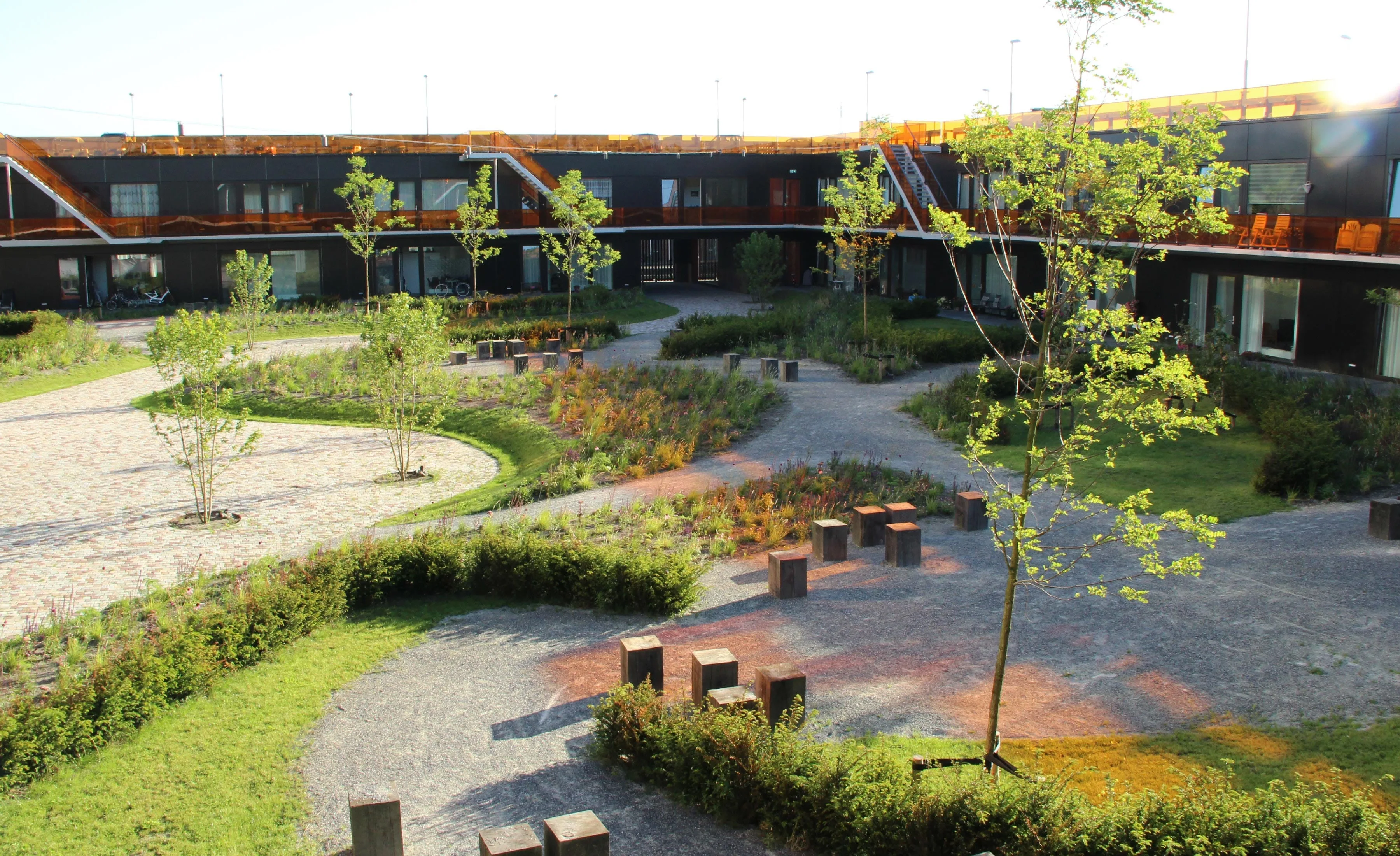 Door een verfijnd ontwerp is zowel een publieke wandelroute als en semi-private tuin voor bewoners gecreëerd. Het optillen van grote delen van de tuin creëert een natuurlijke scheiding tussen de wandelroute en de entrees van de woningen op de begane grond. De semi-private tuin is daarbij voor de woningen aan de begane grond gelokaliseerd. Bewoners hebben uit hun woonkamer daarom zicht op een rijk bloeiende tuin.