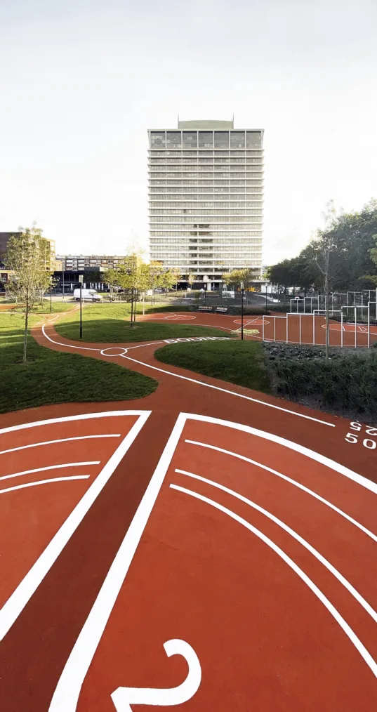 Van een kale stenen woestenij naar levendig groen stadspark: de radicale transformatie van het Bogaardplein is de langverwachte aftrap voor de verdere ontwikkeling van het Rijswijkse stadscentrum In De Bogaard. Structurele vergroening is het uitgangspunt om de leefbaarheid en weerbaarheid van de stad te optimaliseren. Door zoveel mogelijk natuur te verweven met de functionele aspecten van het stadspark als sociaal knooppunt, een plek om elkaar te ontmoeten, om te ontspannen, om te sporten en te spelen, worden ook duurzame doelstellingen voor de stad behaald. Denk daarbij aan klimaatadaptatie – de bestendigheid tegen hittestress en de opvang van hemelwater – en het bevorderen van biodiversiteit, gezondheid en welzijn.