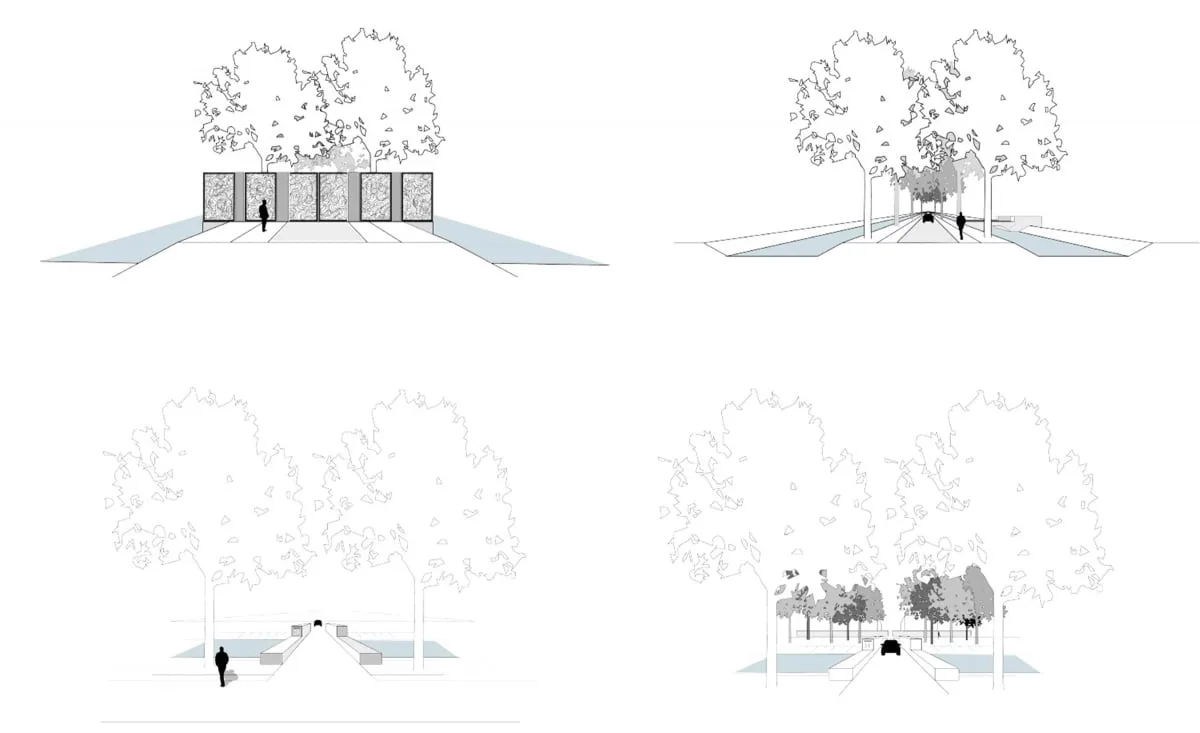 De oorspronkelijke formele en royale oprijlaan wordt weer teruggebracht in de vorm van een eikenlaan met aan weerszijden een brede sloot, die de laan extra allure meegeeft en de laan even losmaakt van de bospercelen aan weerszijden.