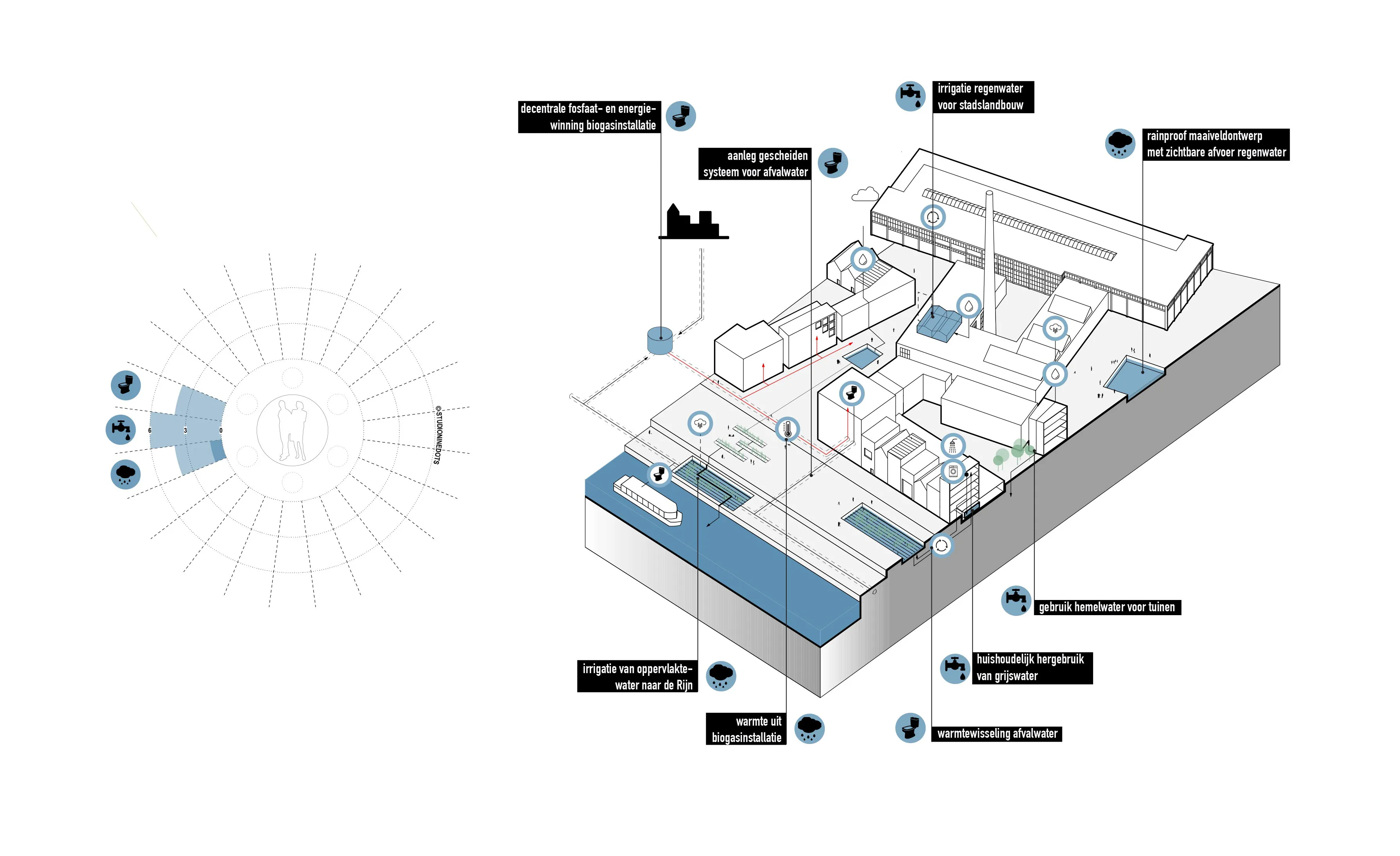 Uit huishoudelijk afvalwater (toilet en keuken) zal energie en fosfaat teruggewonnen worden. Middels warmtewisselaars in badkamers zal bijvoorbeeld warmte uit douchewater teruggewonnen worden. Ook de Rijn wordt ingezet om energie uit terug te winnen. Door middel van een WKO kan warmte worden gewonnen.