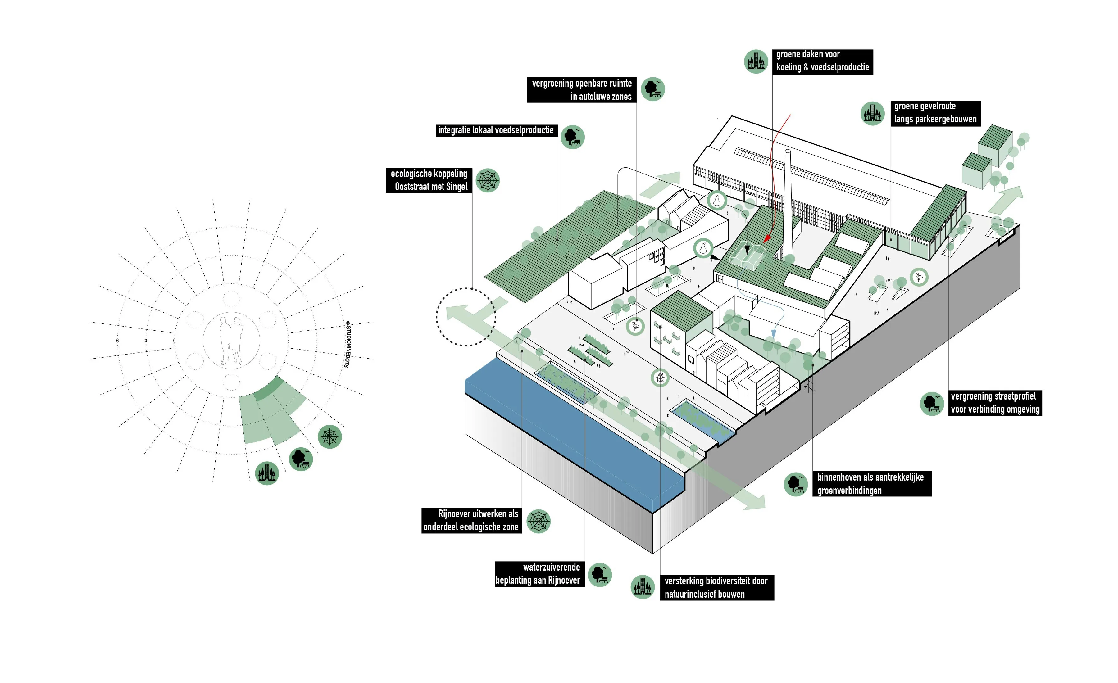 Om de diversiteit aan groen te vergroten is de openbare ruimte onderverdeeld in verschillende types groen. De singel is een belangrijke wandel- en fietsverbinding met de stad en kade. Daarbij dient de singel als geluidbuffer met de ‘Urban Oase’. De goede doorwaadbaarheid van het Coberco-terrein zal door bijvoorbeeld een Groene Gevel Route en een rijke familie van bomen aangenamer worden. De binnenhoven worden groen en blauw. De hoven zelf vormen collectieve groene ruimtes en zijn zo vormgegeven dat er toevalige ontmoetingen ontstaan. Het gebied levert een actieve bijdrage aan de biodiversiteit door natuurinclusief te bouwen, maar ook productieplekken, groene daken en gevels dragen hier aan bij. Het Waterfront wordt uitgewerkt als ecologische verbindingszone. Waterzuiverende beplanting filtert hier tevens het water dat uit het terrein afkomstig is.