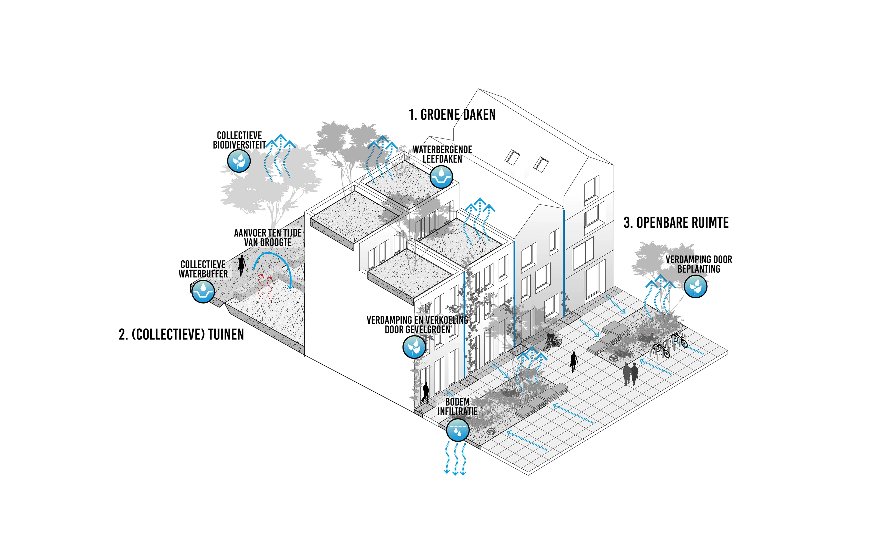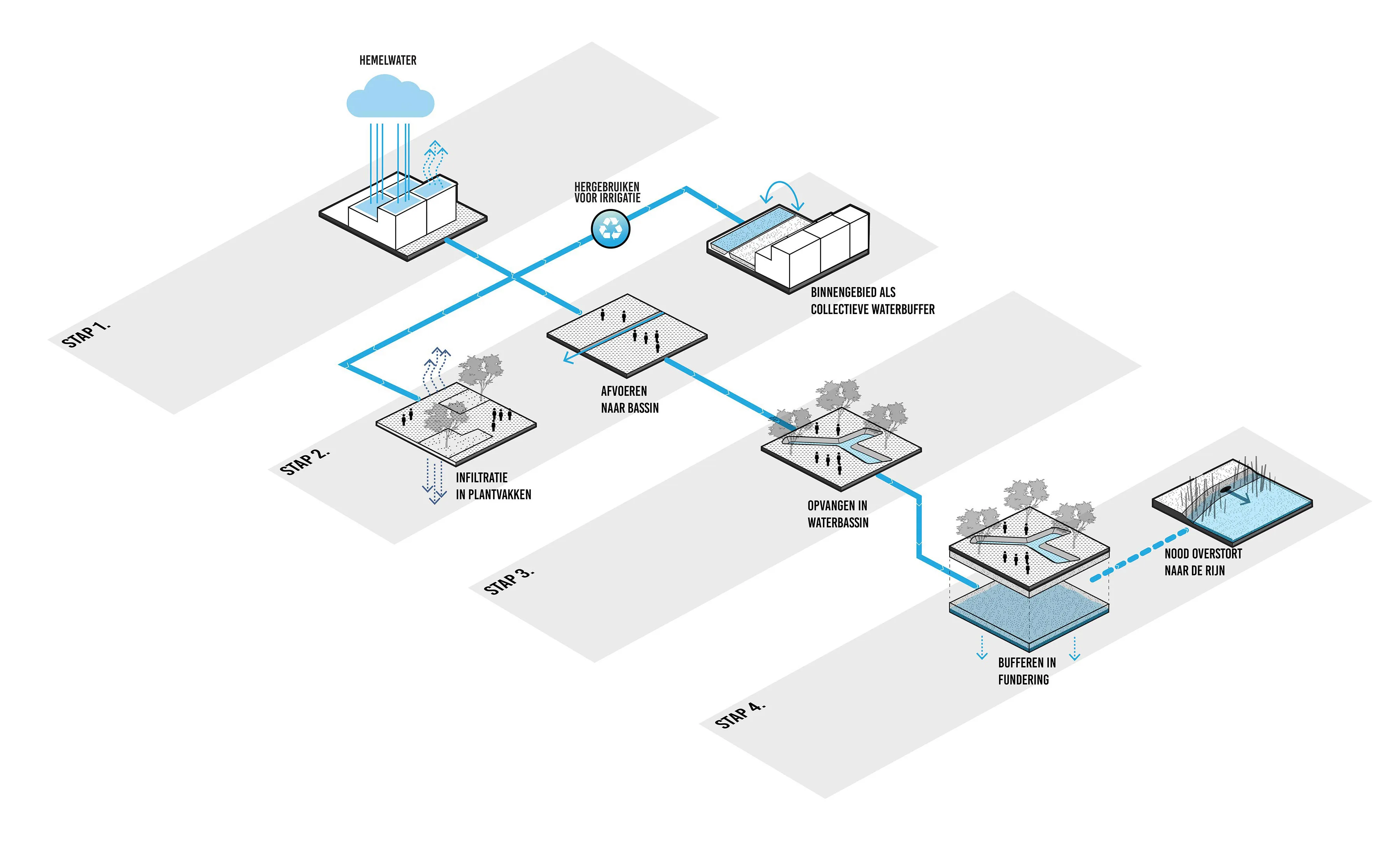stap 2: Het water in de binnentuinen wordt collectief verzameld en teruggeven aan de beplanting ten tijde van droogte. Het overige water wordt via een goot naar de waterbassins gebracht. Een deel van het regenwater op het maaiveld wordt afgevoerd naar de plantvakken en infiltreert daar.