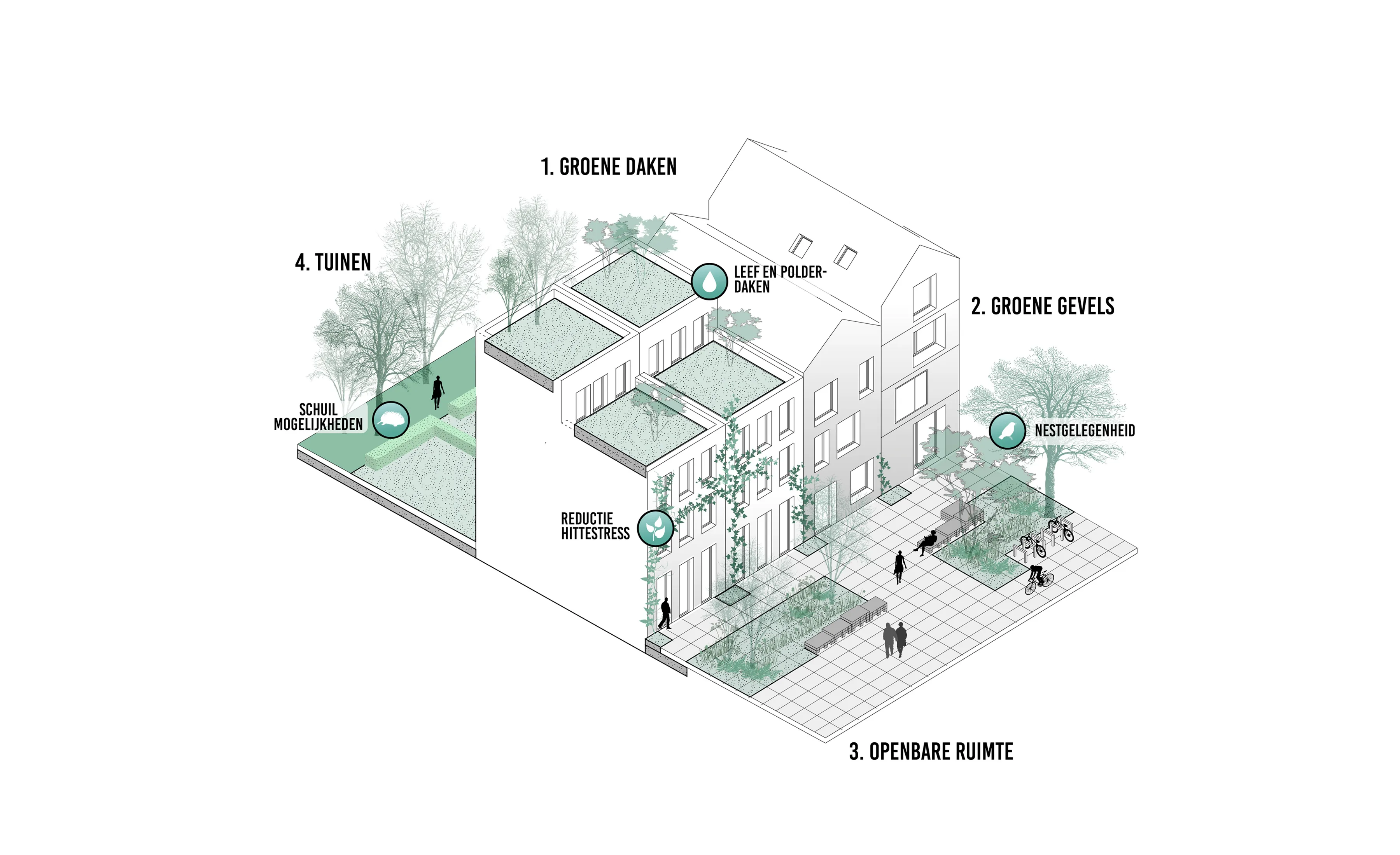 De inrichting van de openbare ruimtes hebben een groen karakter en zijn ingericht ten behoeve van langzaam verkeer. Dit levert een prettige leefomgeving op buurtniveau op die sociaal en duurzaam is. Pleinen, parken en straten worden ingericht met zitelementen en een gevarieerd sortiment bomen en stuiken.