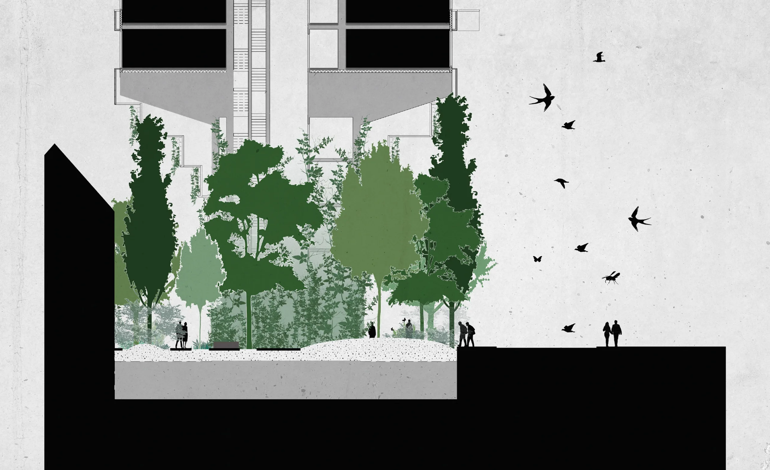 Hiermee vormt De Nieuwe Eindhoven een prachtige kans om onze visie, verdichting inzetten voor de vergroening van de stad, in de praktijk te brengen. Naast een bijzondere entreeruimte creëren we een stadstuin waarin kleinschaligheid een unieke, geborgen sfeer vormt aan de Vestdijk. De materialisatie stemmen we af op de architectuur zodat het project één geheel vormt. De wandelpaden en zitplekken maken het een prachtige plek om te passeren én verblijven. Vele bomen zorgen voor een filtering van het licht zodat er een ultiem comfortabel verblijfsklimaat ontstaat. De ultieme verbinding tussen architectuur en de stadstuin wordt gevormd door een verticale, groene wand van op sokkel die we beplantingen met inheemse, streekeigen soorten.