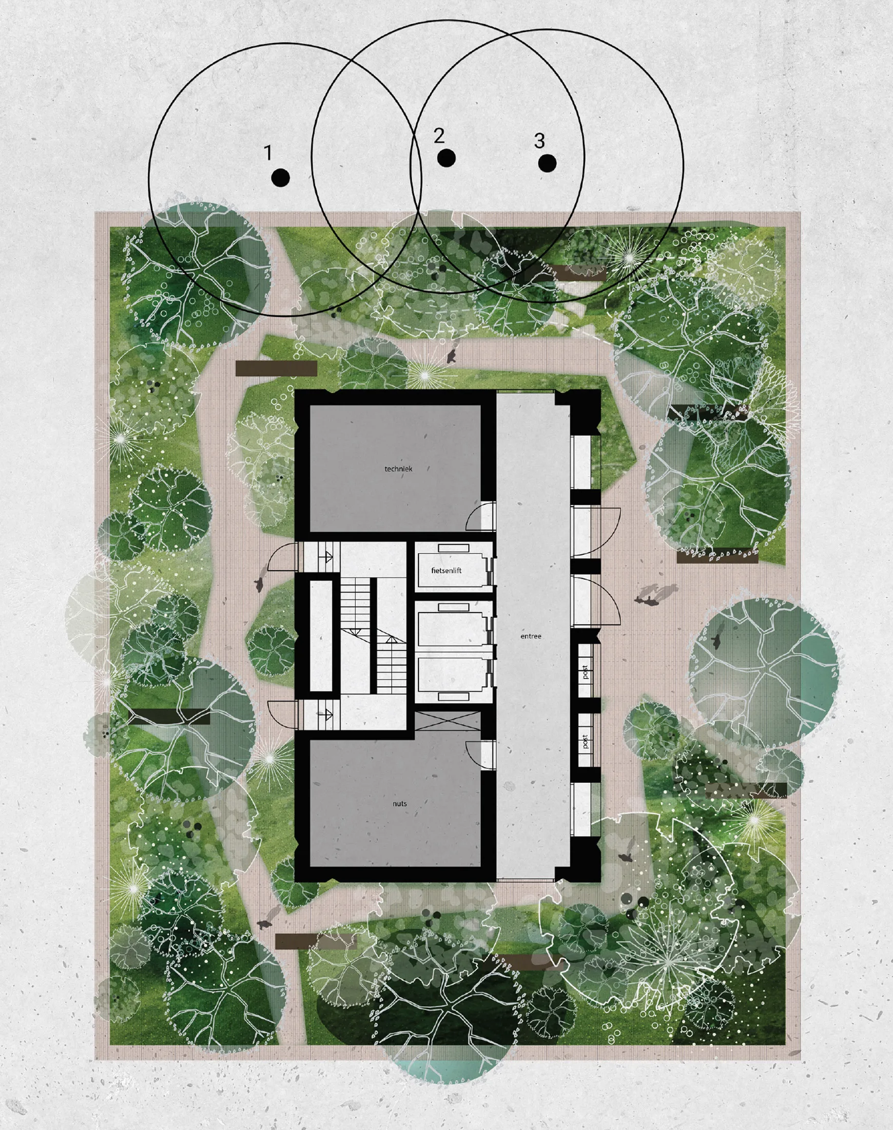 Door het ingenieus inpassen van de woontoren wordt er publieke ruimte gecreëerd.