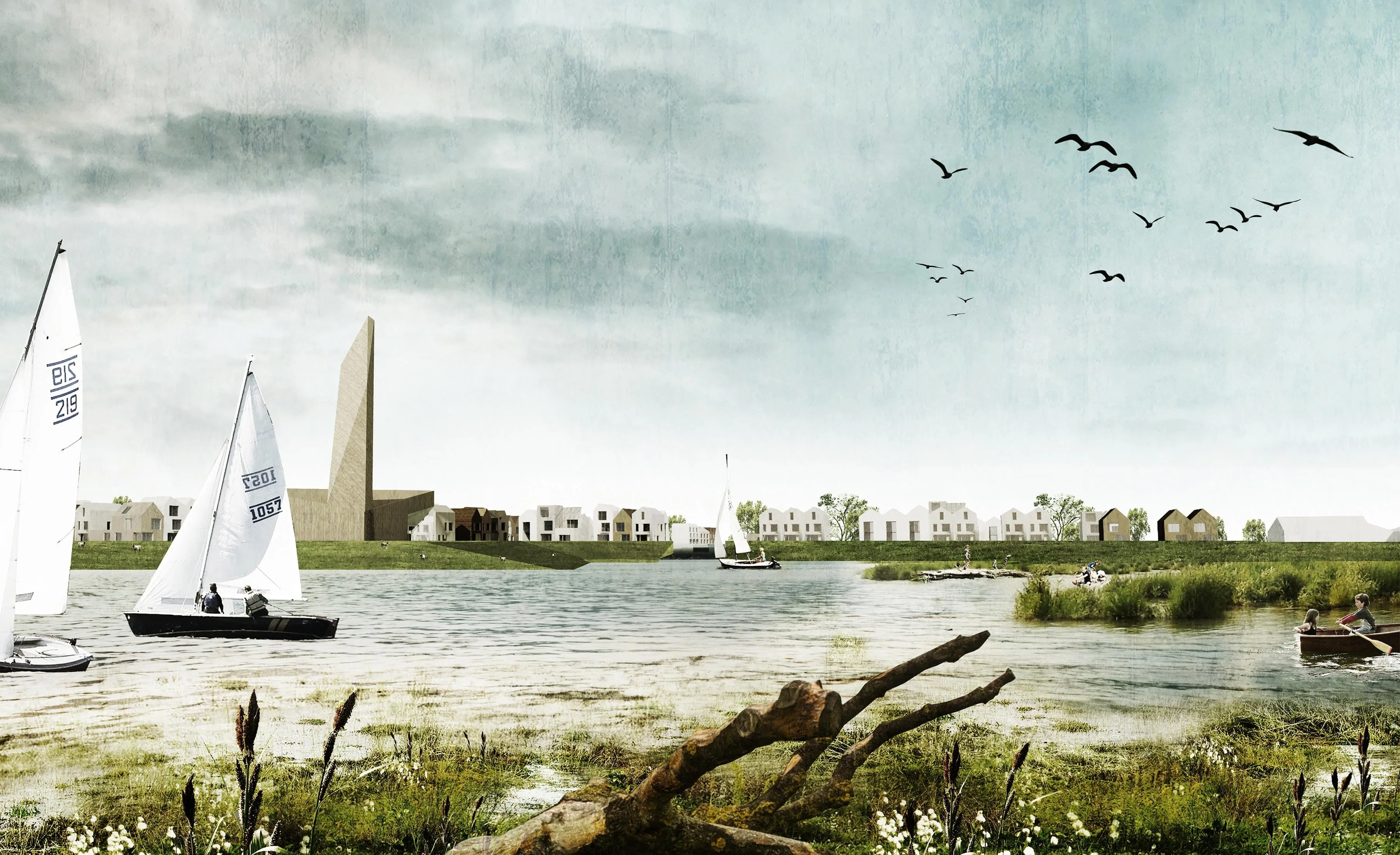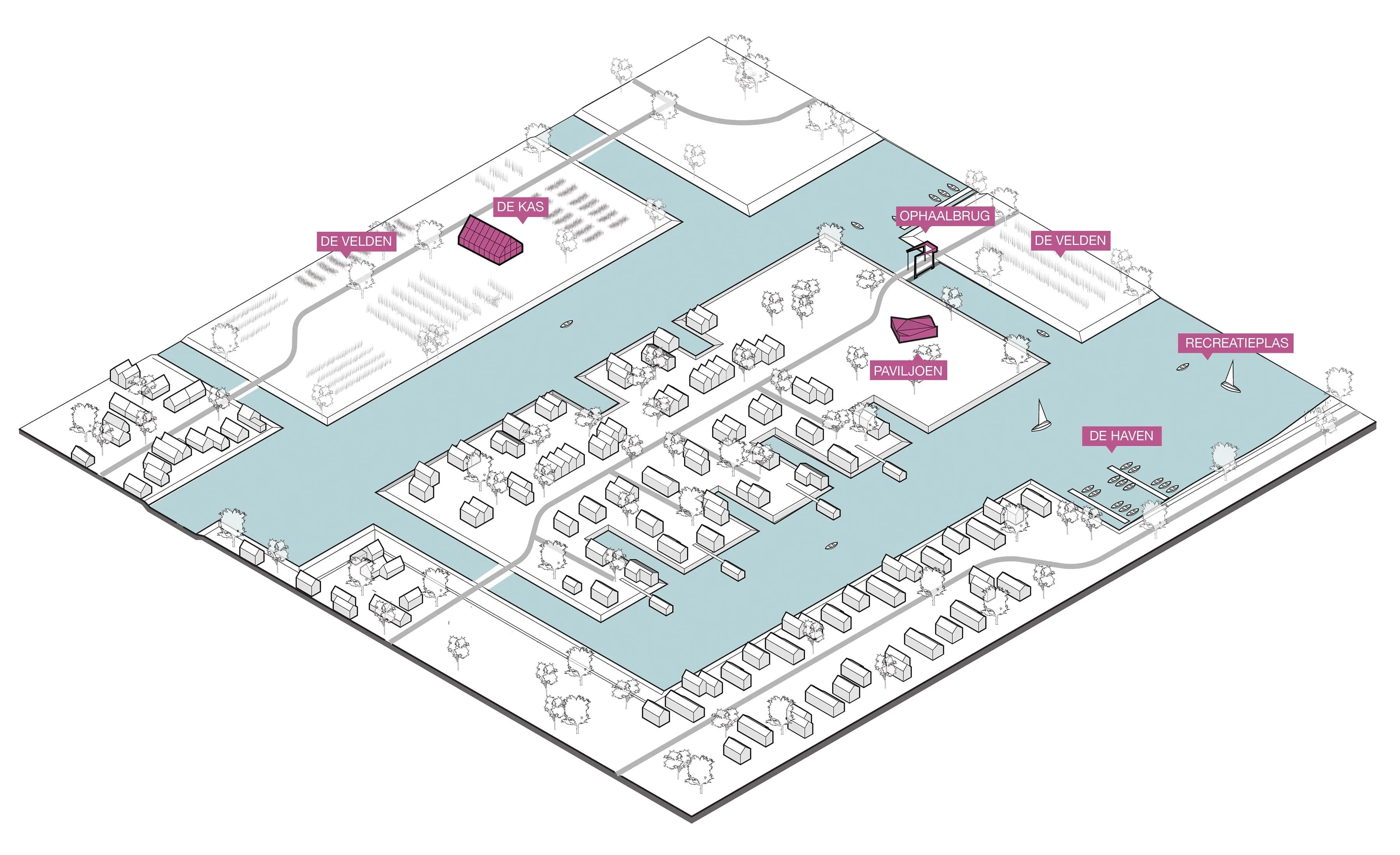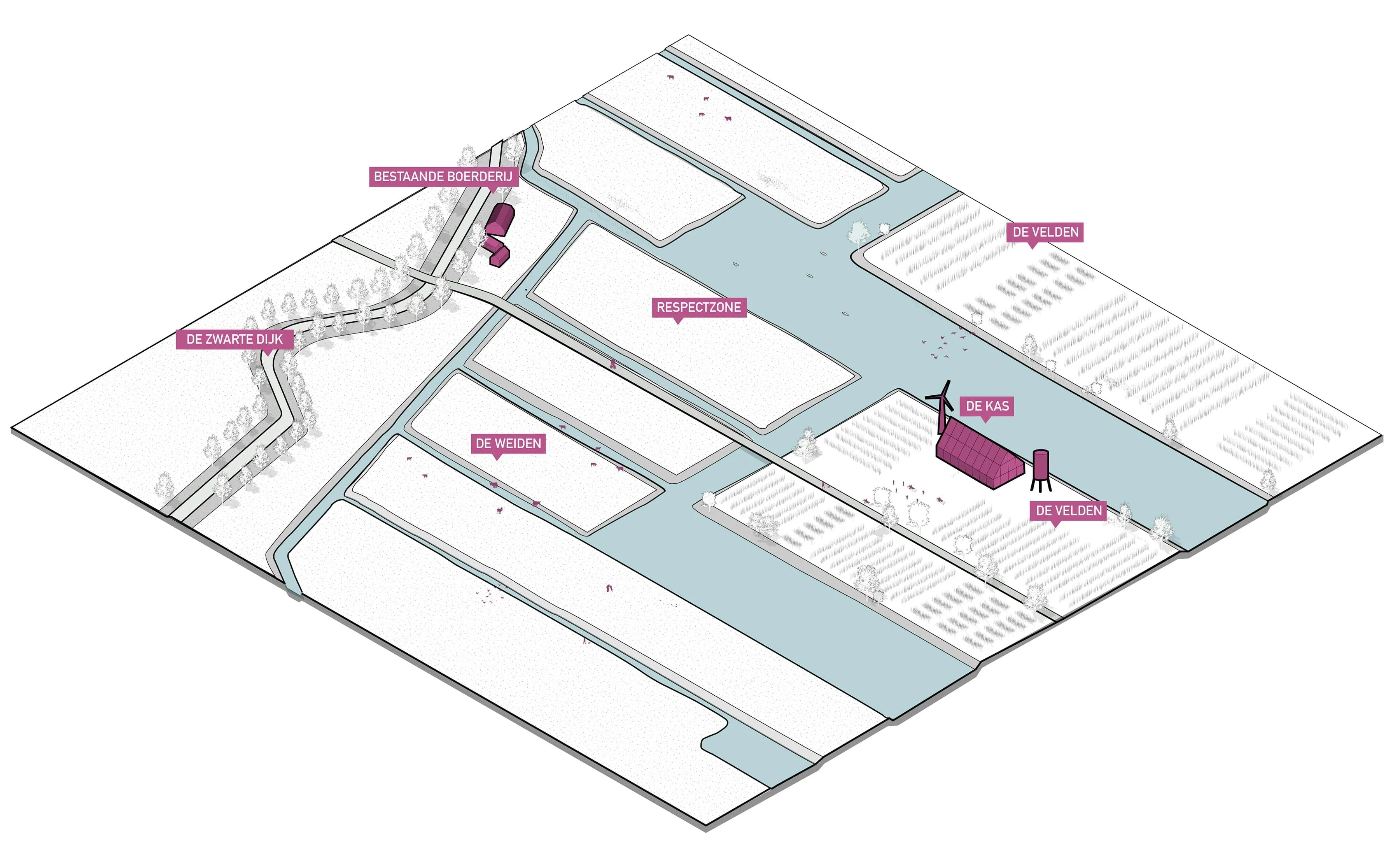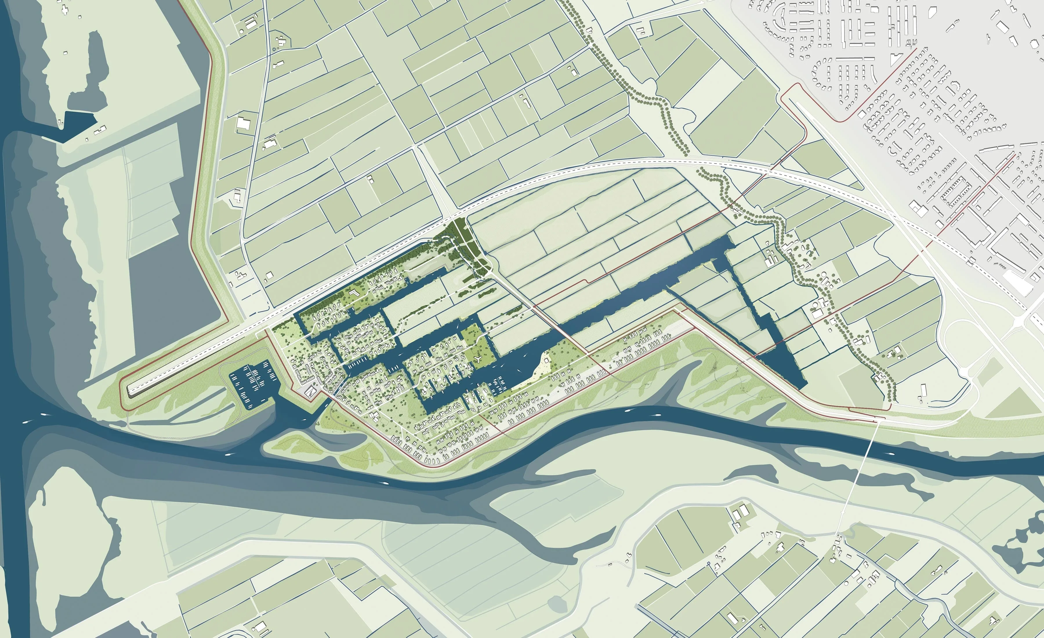 De stedenbouwkundige opzet ontleent zijn structuur aan de bestaande polderstructuur, waarbij de rechte doorgaande waterlijnen in het landschap centraal staan. Een aantal bestaande sloten worden verbreed en deze bepalen het framework voor de nieuwe structuur. Er ontstaat een serie van eilanden, passend binnen de bestaande vormentaal van het landschap.