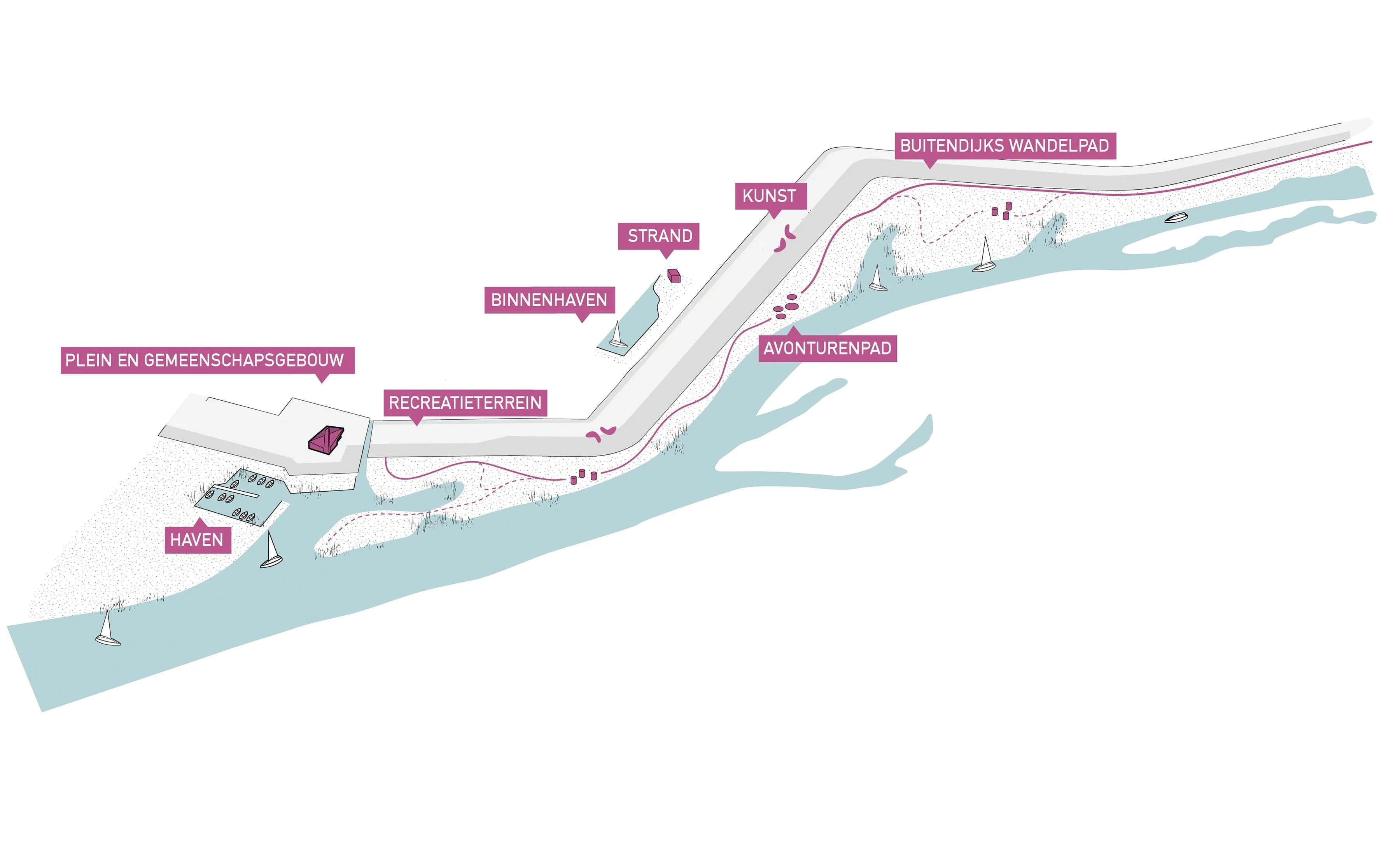 Buitendijks is ruimte voor programma gericht op een groter publiek. Naast de buitendijkse haven zien we hier kansen voor een ligweide/evenementenruimte. Een laagdrempelige en ingetogen plek, met name gericht op tieners, jonge gezinnen en rustzoekers. Daarnaast zal een avonturenpad de nieuwe natuur en het Reevediep beleefbaar maken. Een struinpad voor jong en oud, waar wandelen door het landschap wordt gecombineerd met spelaanleidingen en zitgelegenheden om tot rust te komen. Binnen de dijk ligt het accent op comfortabel wonen aan het water. Het binnendijkse strandje vormt samen met de binnenhaven en het dorpsplein een plek voor ontmoeting en activiteit.