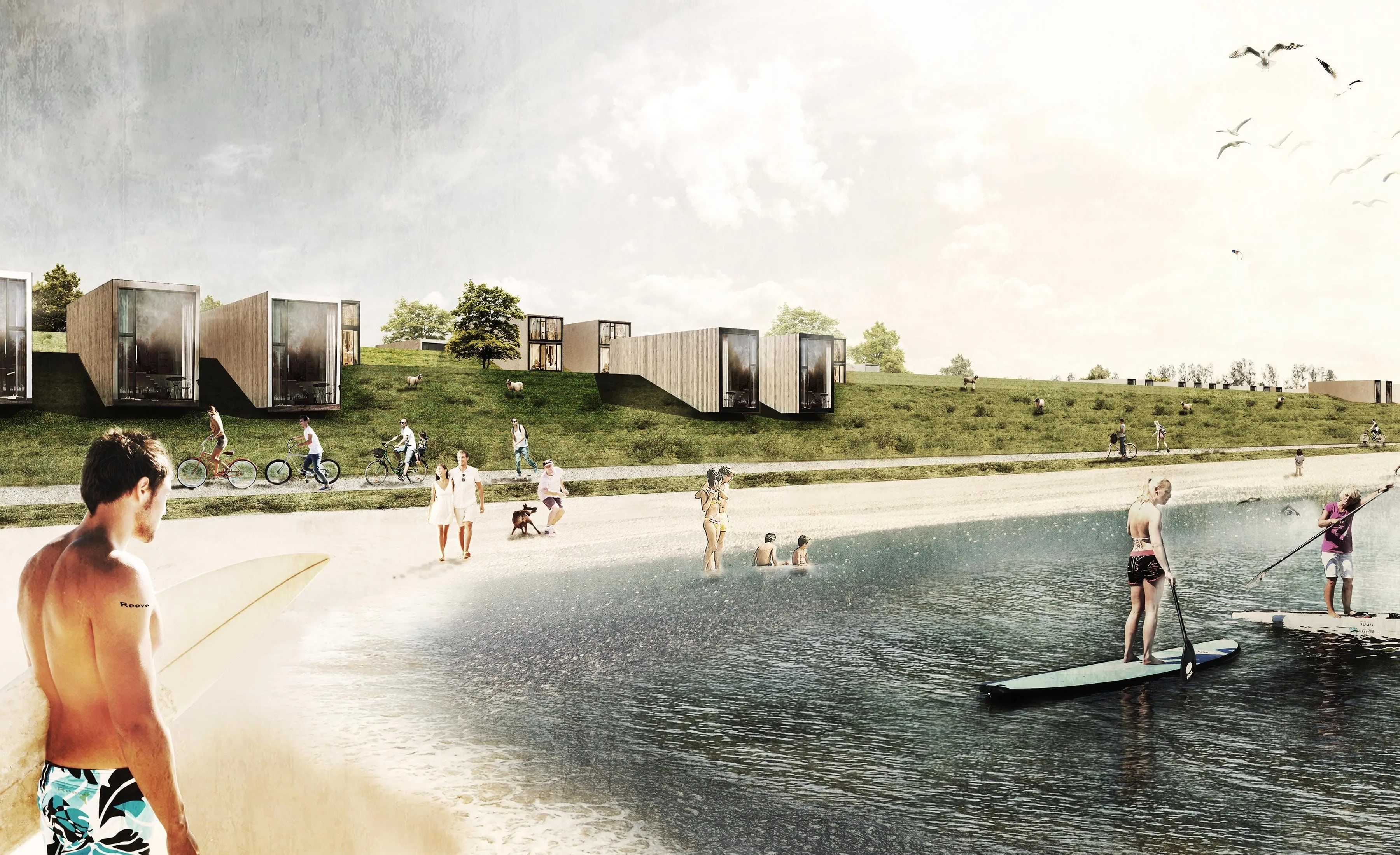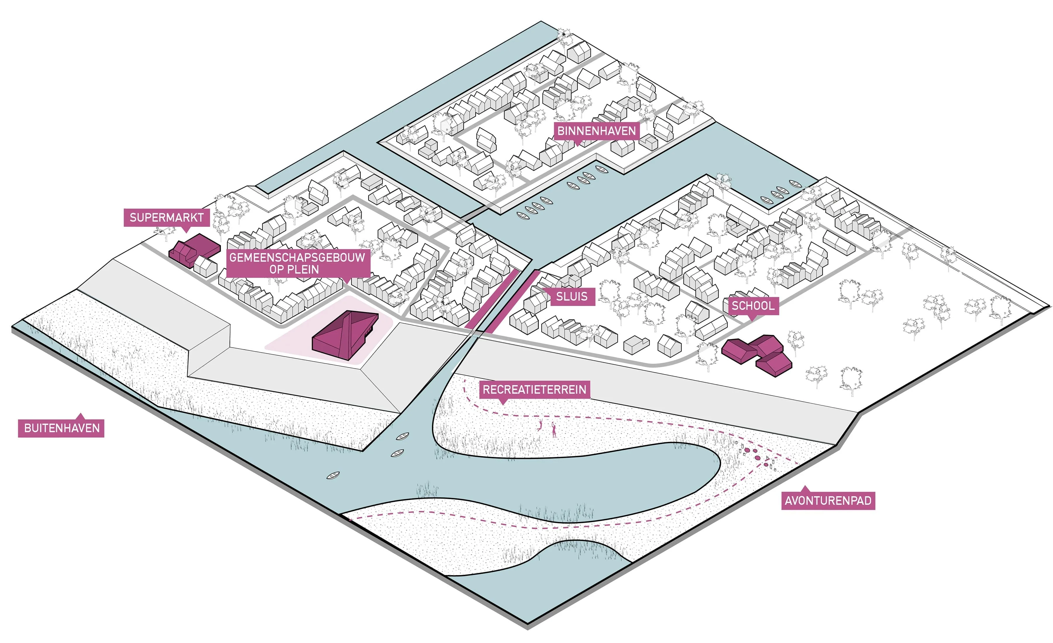 De bebouwing wordt geclusterd en ligt als eilanden in het landschap op de klimaatdijk. Door de clustering is er ruimte voor het doortrekken van de groene ruimte tussen de clusters. Het omliggende landschap wordt zo ontworpen dat het uitnodigt voor wandelen en ontmoeting en ook de speelelementen zullen hier op een logische en natuurlijke wijze geïntegreerd worden.