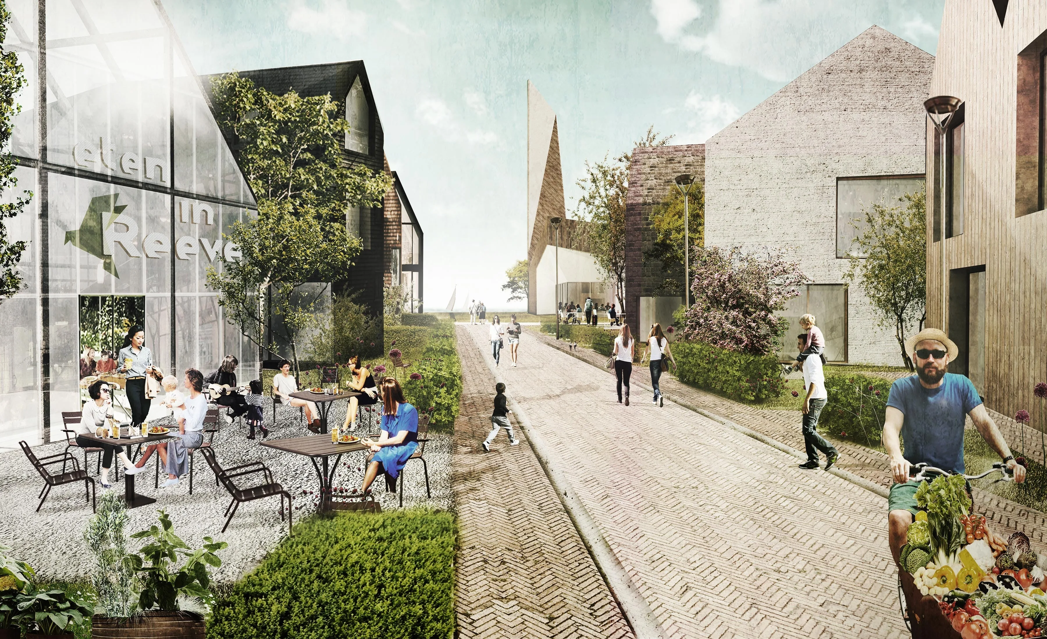 De dijk met de fiets- en wandelstructuren sluit aan op het dorpsplein. Dit vormt het hart van Reeve. Zowel emotioneel als functioneel. Hier bevinden zich de voorzieningen en reuring. Denk hierbij aan een horecagelegenheid en take away. De functies zijn ondergebracht in het ‘icoon’ / gemeenschapsgebouw, een bouwwerk dat als ‘community space’ gebruikt wordt. Het icoon geeft het dorp een hart en vormt een trots toonbeeld van haar unieke identiteit. In het gemeenschapsgebouw kunnen ook kleinschalige evenementen, exposities, voorstellingen, etc. georganiseerd worden.