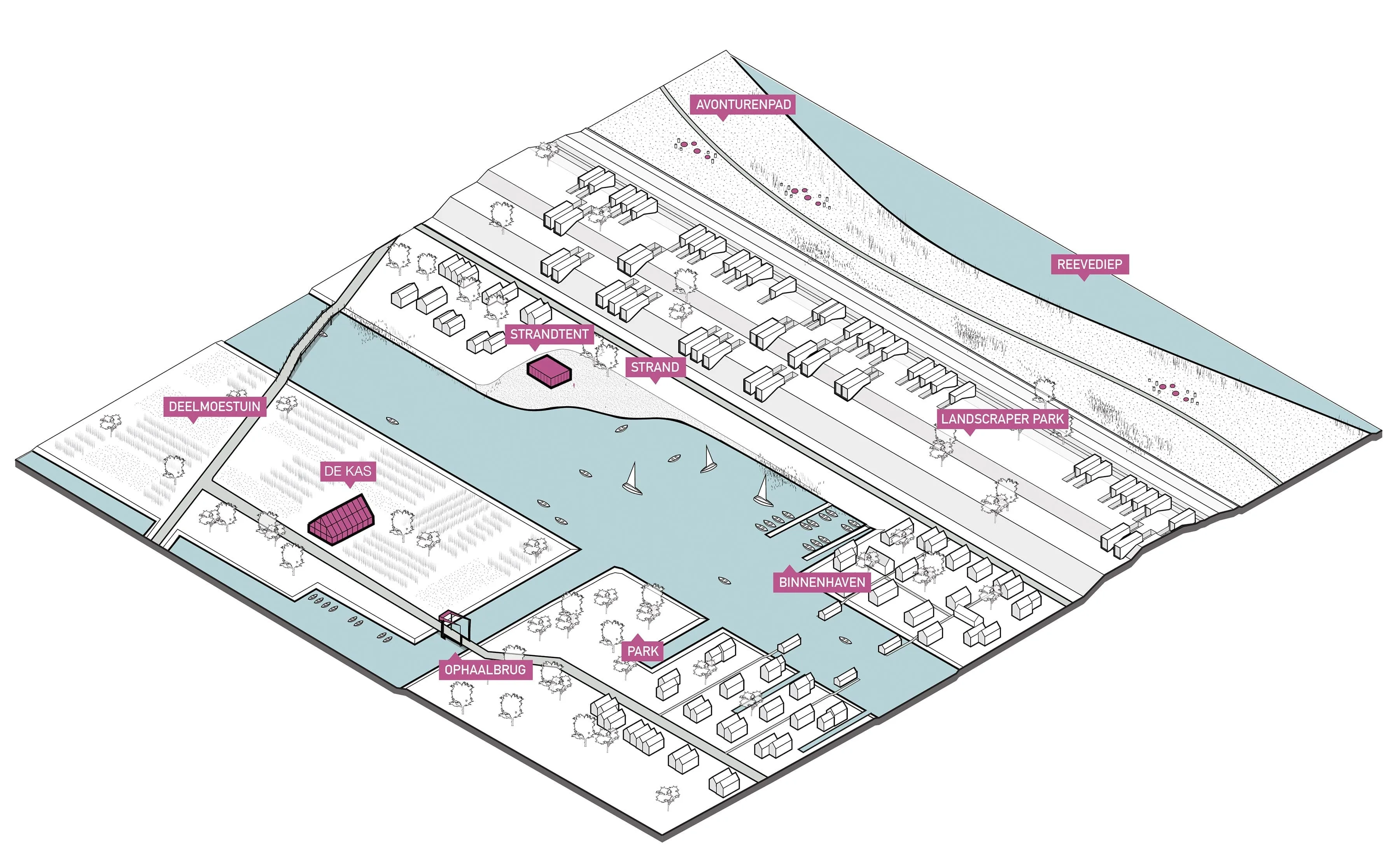 Het hart van Reeve wordt gesitueerd nabij het havenbekken, uitkijkend over het Reevediep. Dit hart wordt nauw verbonden met zijn omgeving door een fijnmazig netwerk van wegen en verbindingen, richting Kampen, langs het Reevediep en naar het station, waardoor het nieuwe dorp naadloos aansluit op zijn omgeving. Met dit hart als basis zal Reeve binnen het framework uitgroeien tot een nieuw dorp in de IJsseldelta.