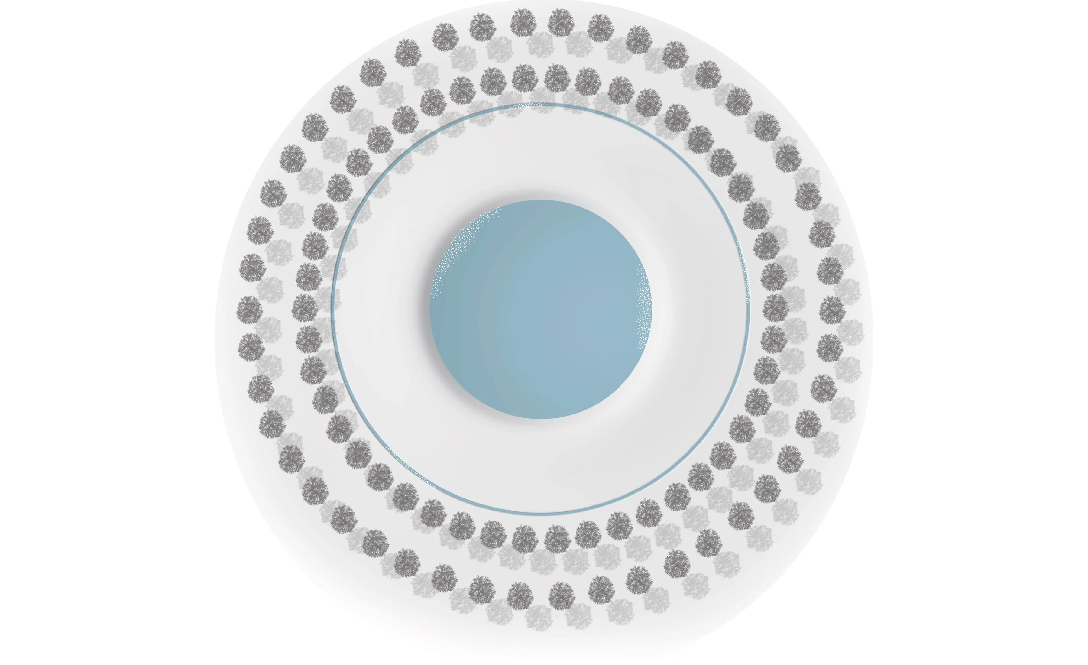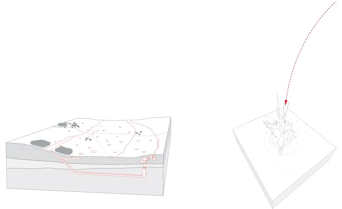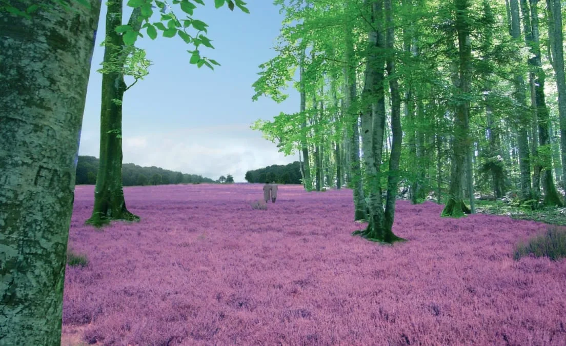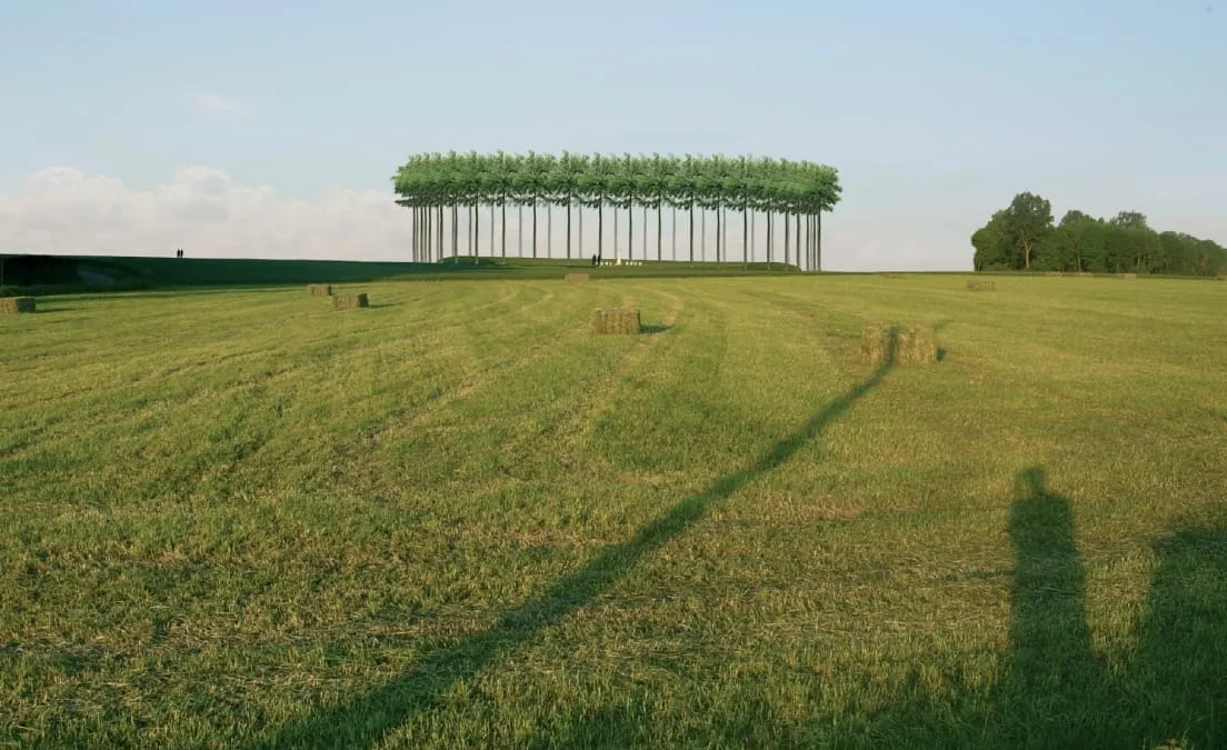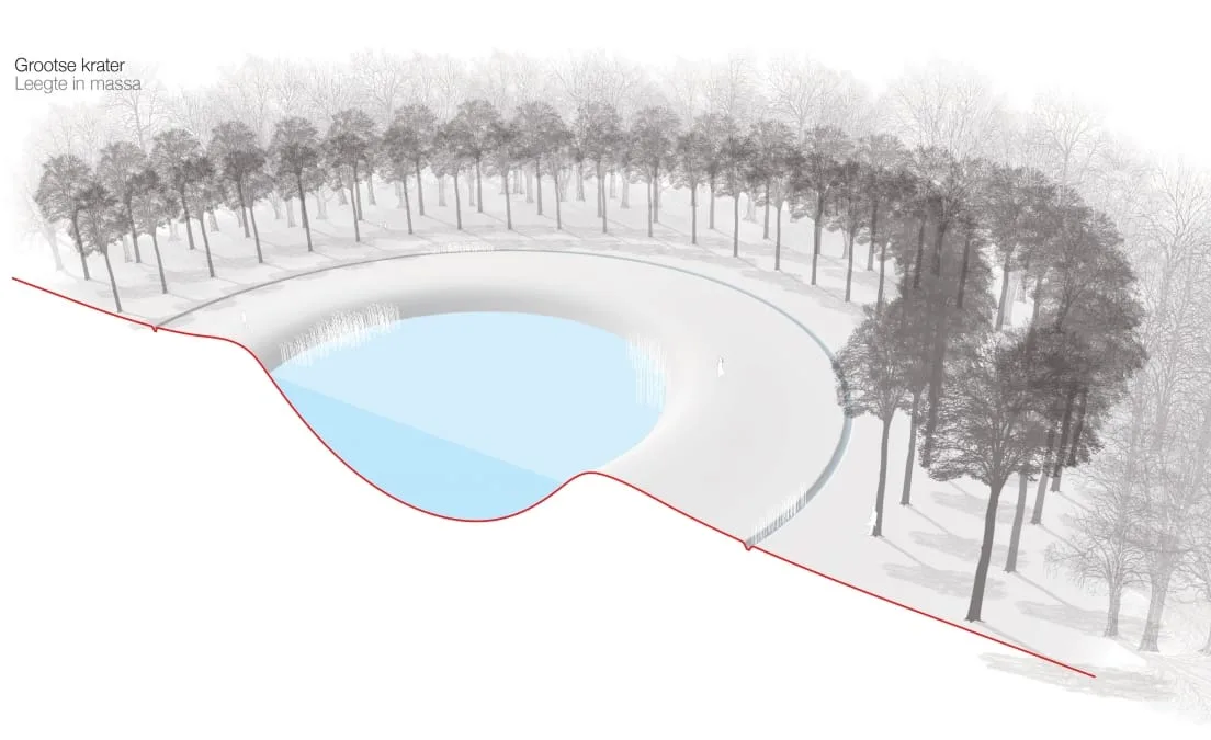 Kleine kraters in het bos worden leegte in de massa. De 19 grootse kraters, ontstaan door ondergrondse ontploffingen, krijgen een dubbele rij Iepen. Het niemandsland, lopend door het bos en soms nauwelijks tien meter breed, wordt vrijgemaakt; een adembenemende leegte in de massa. Door afgraving keren de heidevelden terug. Het Niemandsland lopend over de akkers wordt ervaarbaar door verschuivende bloemvelden.