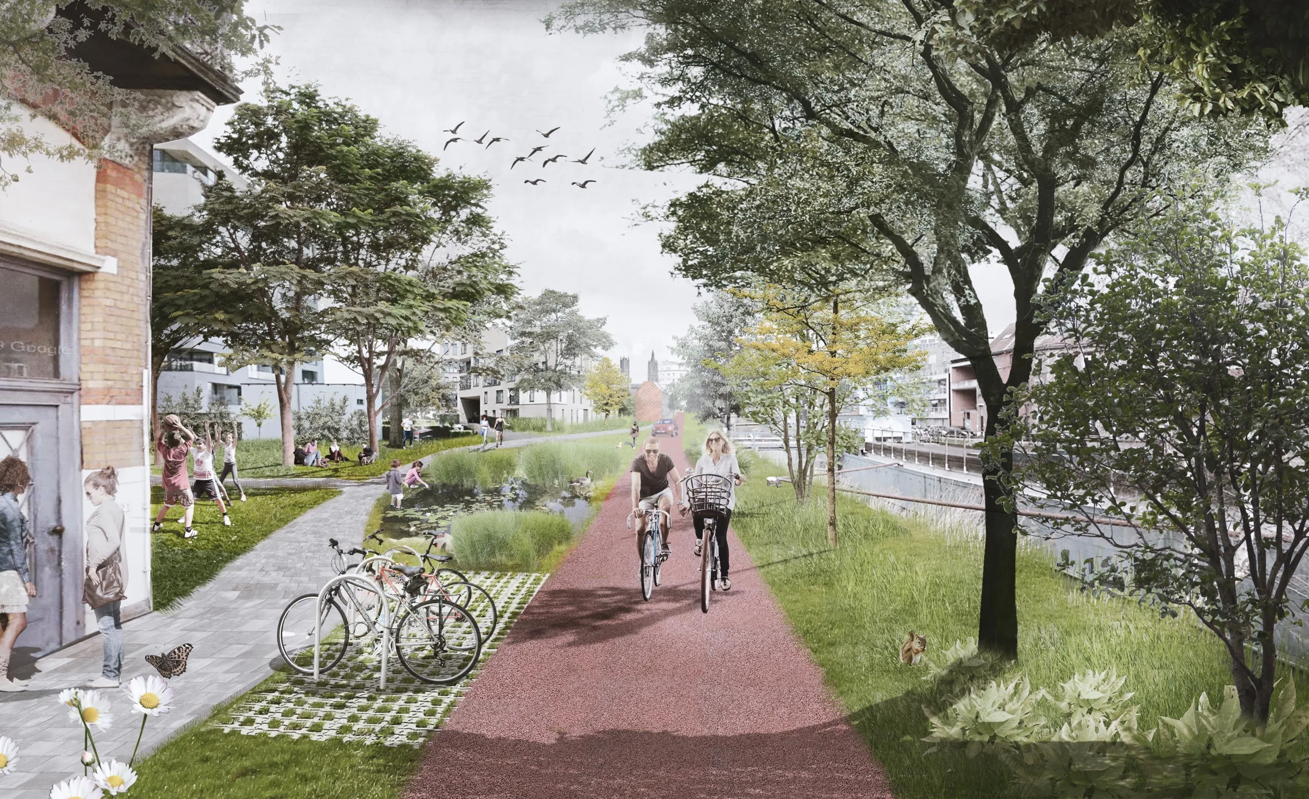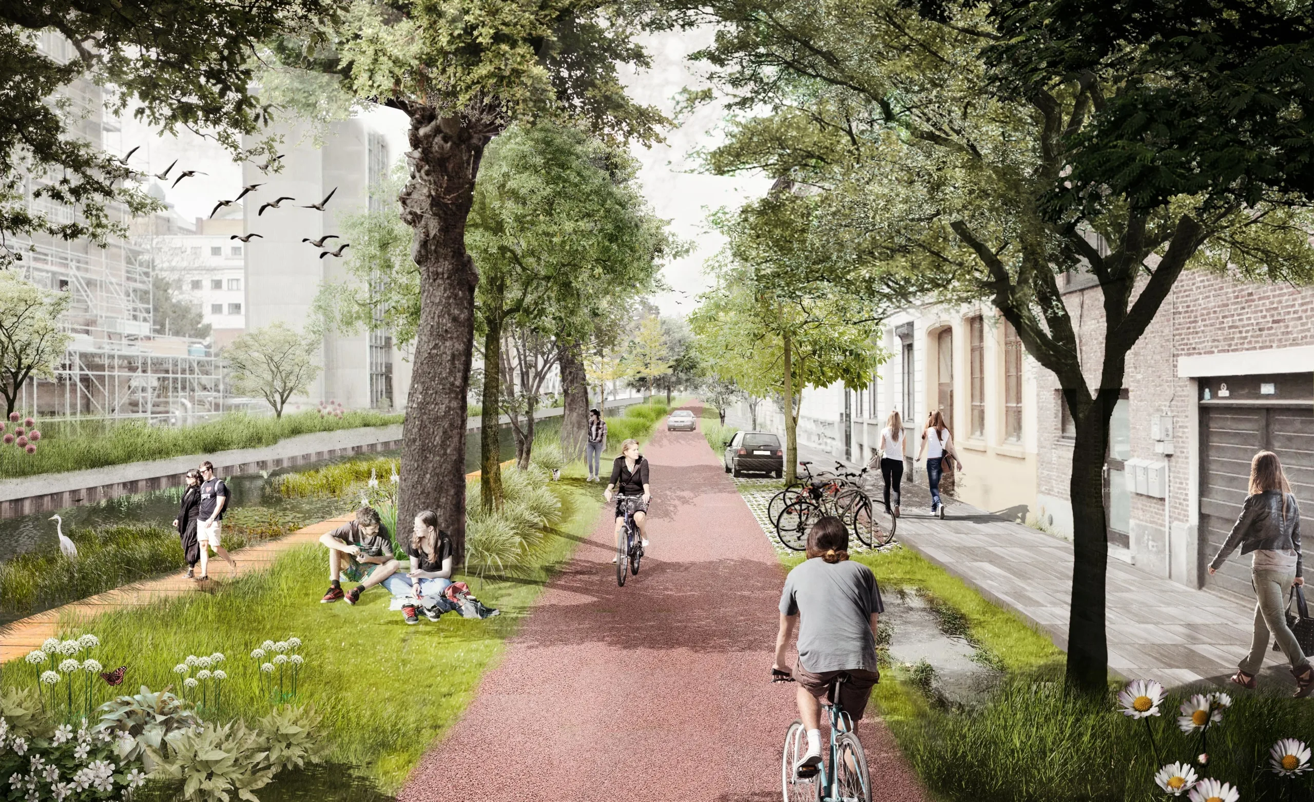 Onder de bestaande kastanjebomen ontwikkelt zich een nieuwe groeneklimaatstraat, met extra meer gevarieerde boomsoorten, waar stapsgewijs het parkeren op straat is verdwenen en een beleefbare ecologische oever wordt ontwikkeld met extra drijvend groen. Door de beperkte beschikbare ruimte wordt er dus gekozen het (secundaire) recreatieve voetpad aan de ecologische oever te leggen, en niet direct naast het fietspad.