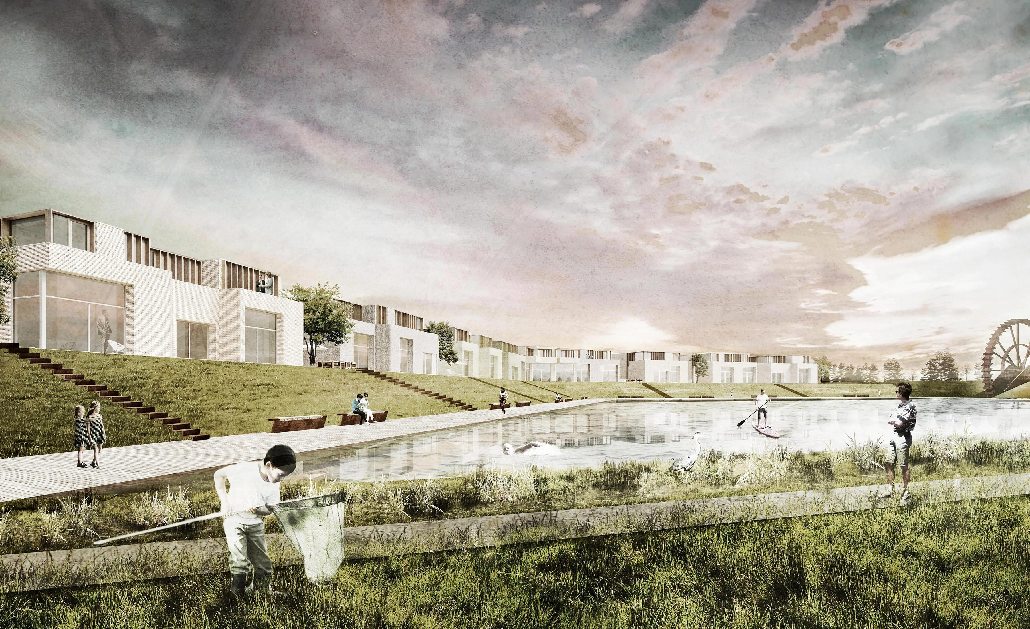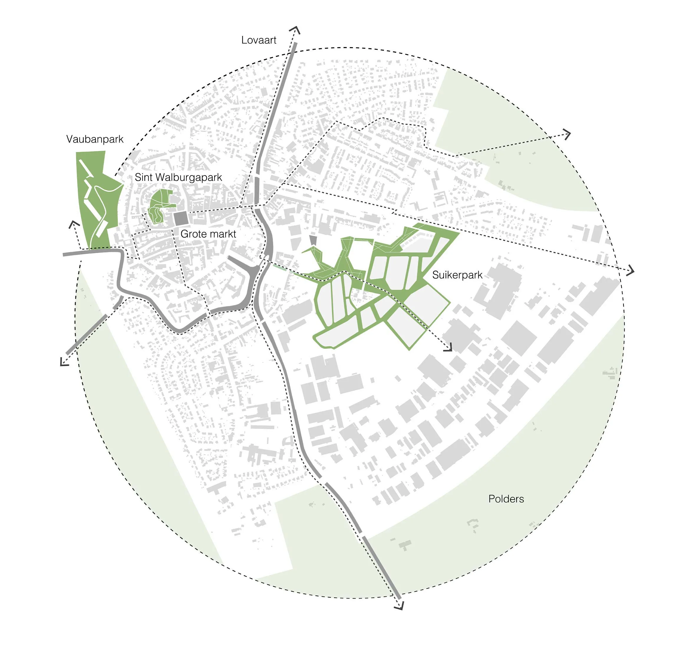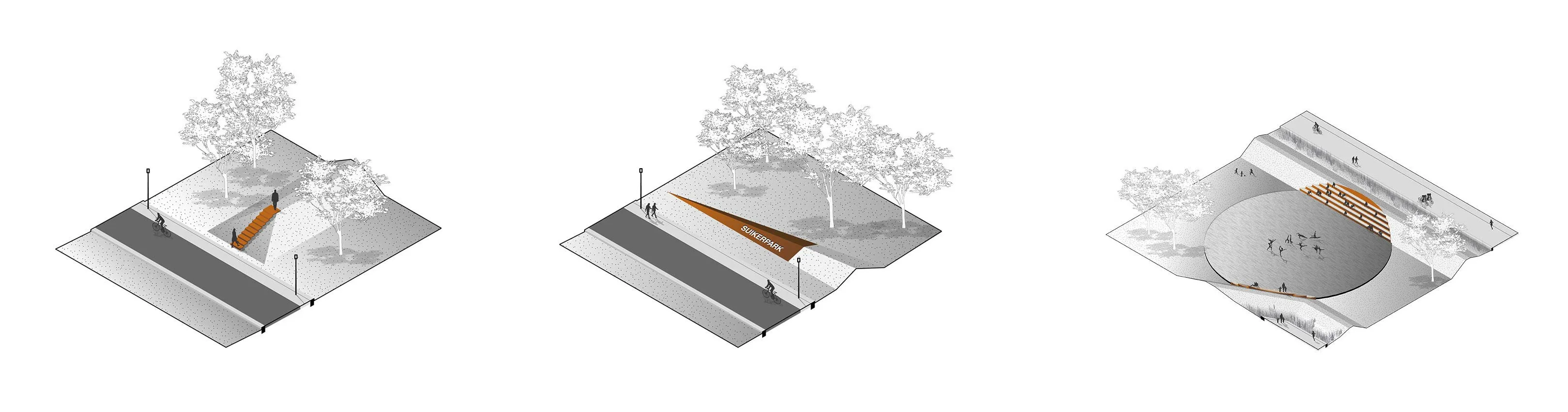 Het Suikerpark, gevormd door zijn dijken, kent veel vrije ruimte en uitgekiende plekken om te zitten en te rusten, te zien en gezien te worden en natuurlijk mensen te ontmoeten. Met het ontwerp krijgt Veurne er een landschapspark en stadsplein bij.
