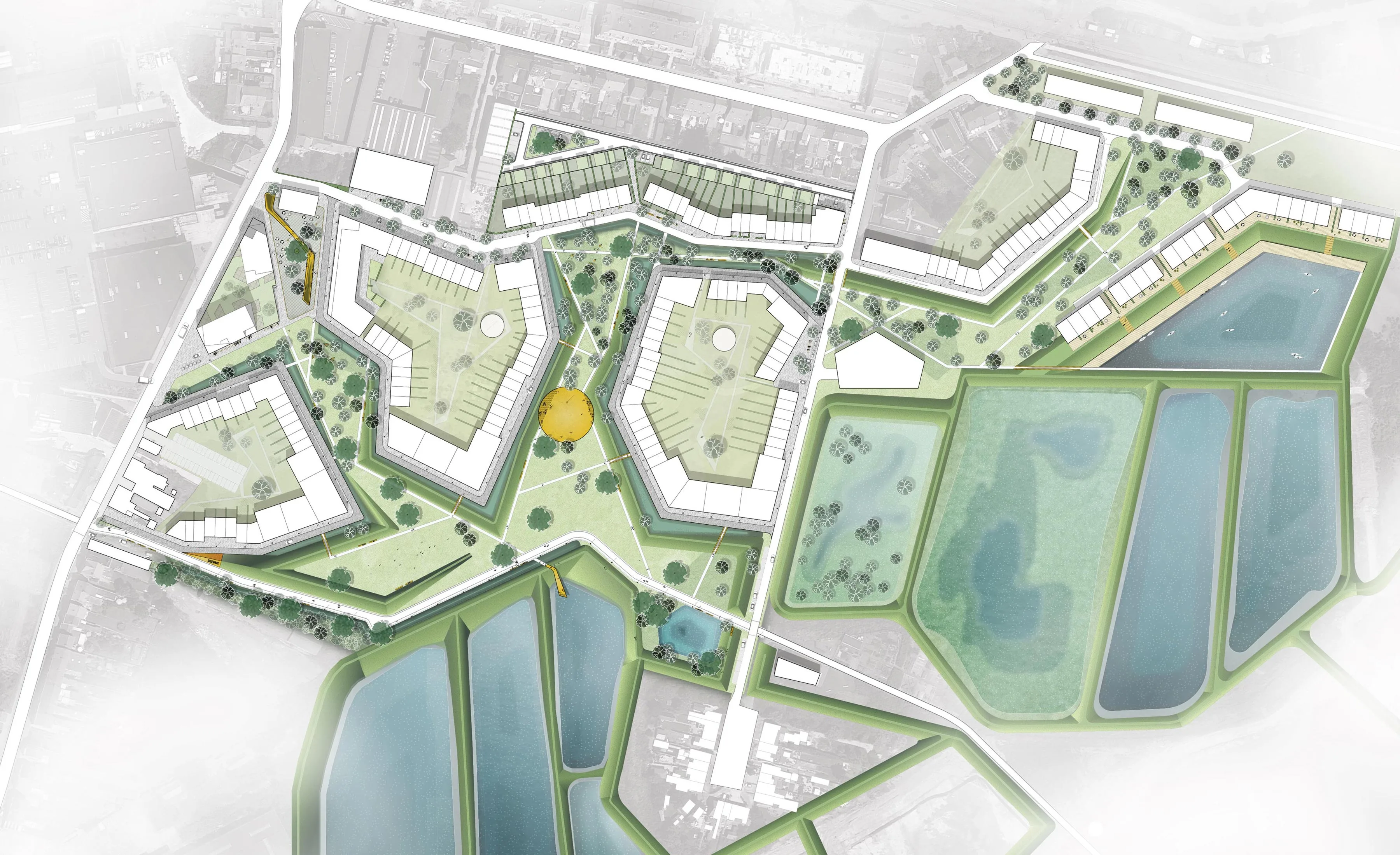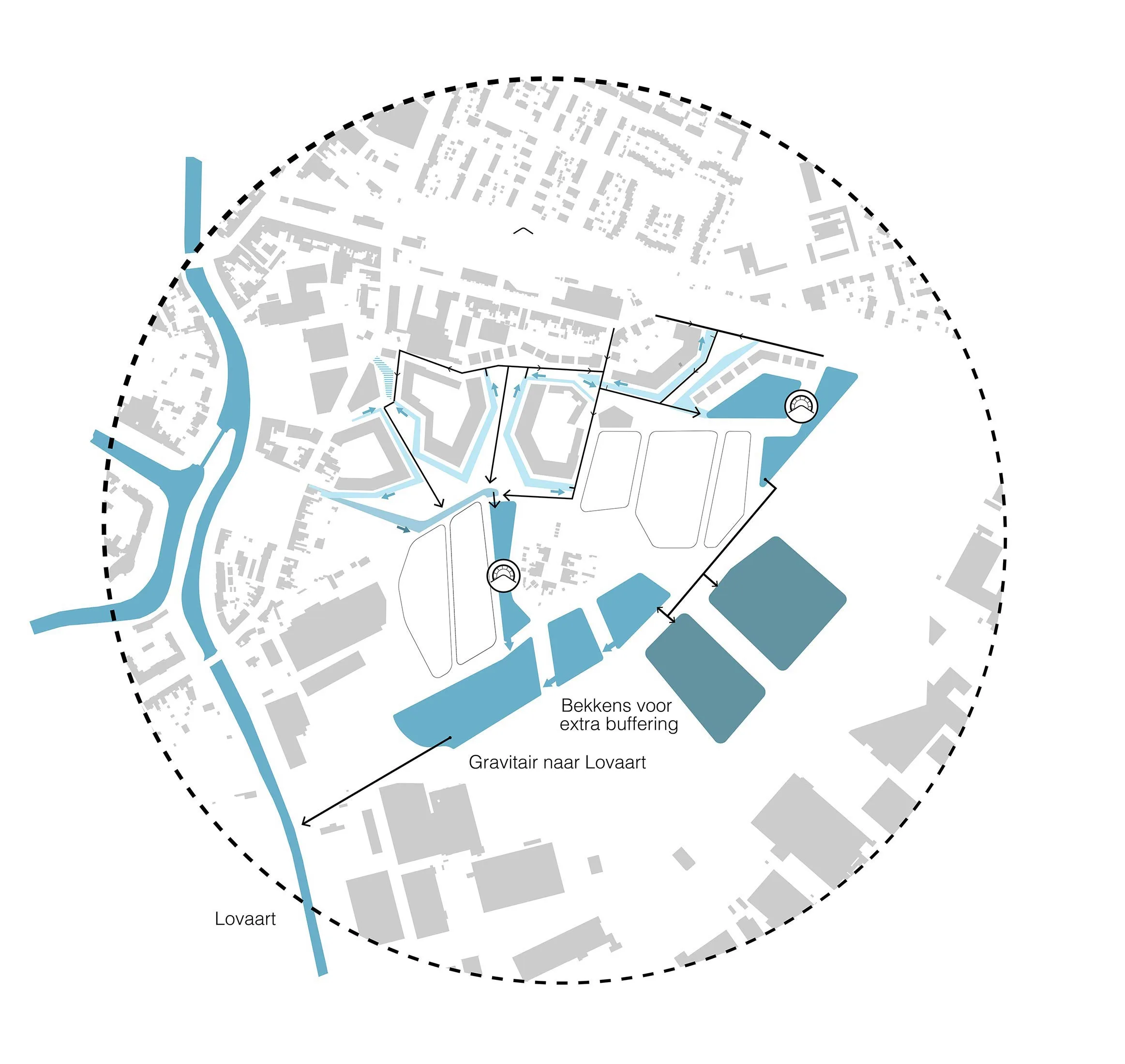 Water vormt een duidelijk onderdeel van het DNA van de totale site.Uitgangspunt binnen het plan is dat regenwater geen belasting vormt voor het rioolstelsel en een positief effect te genereren voor de dalende grondwatertafel.