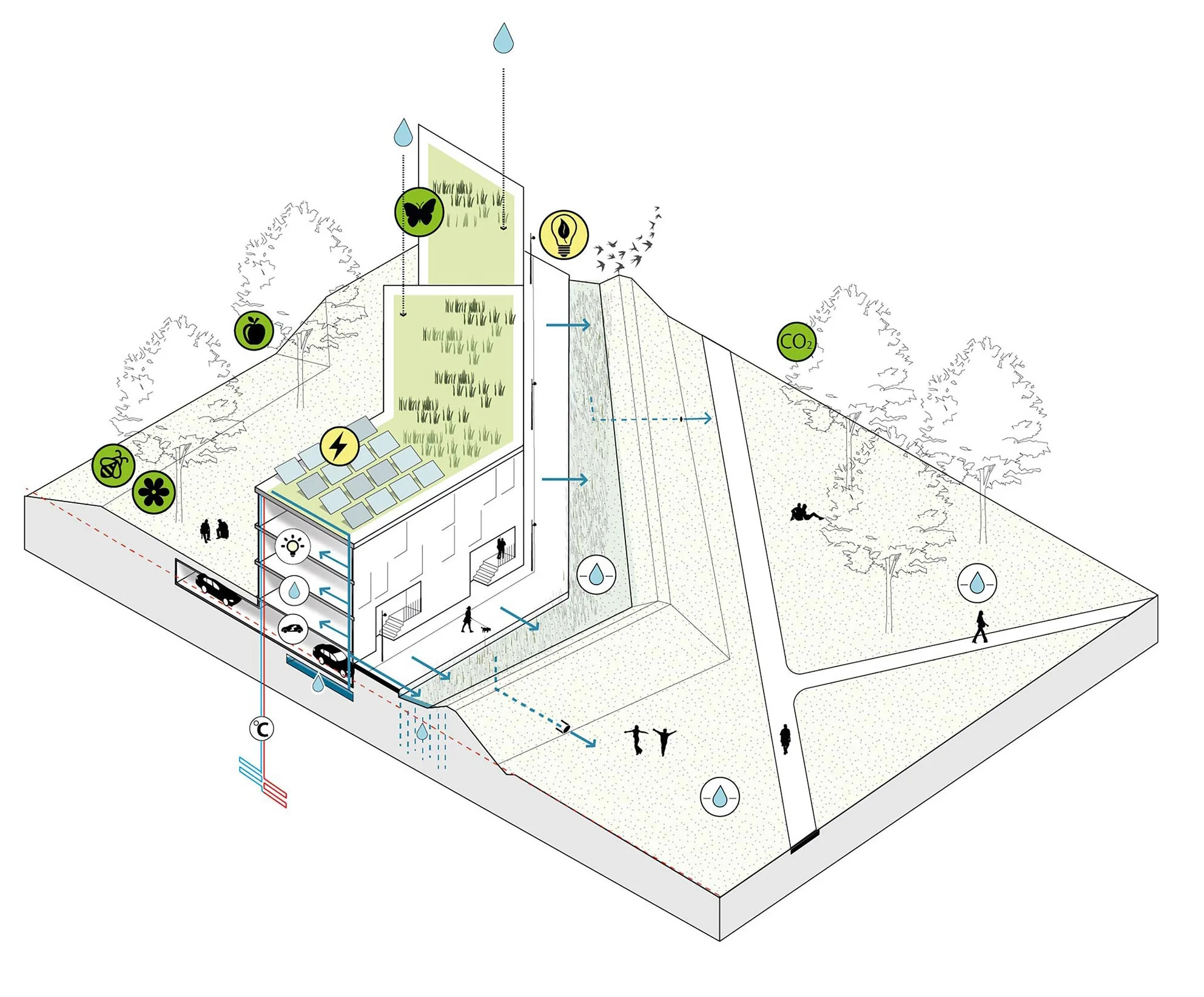 Groene daken zorgen dan weer voor minder warmteverlies. Tevens zorgen de groene daken voor het bufferen en vertraagd afvoeren van water. Water dat bij het afvoeren opgeslagen wordt om in de woning te gaan hergebruiken. Wateroverschot wordt geïnfiltreerd tussen woning en dijk. En levert een bijdragen aan het omhoog brengen van de grondwaterstand.