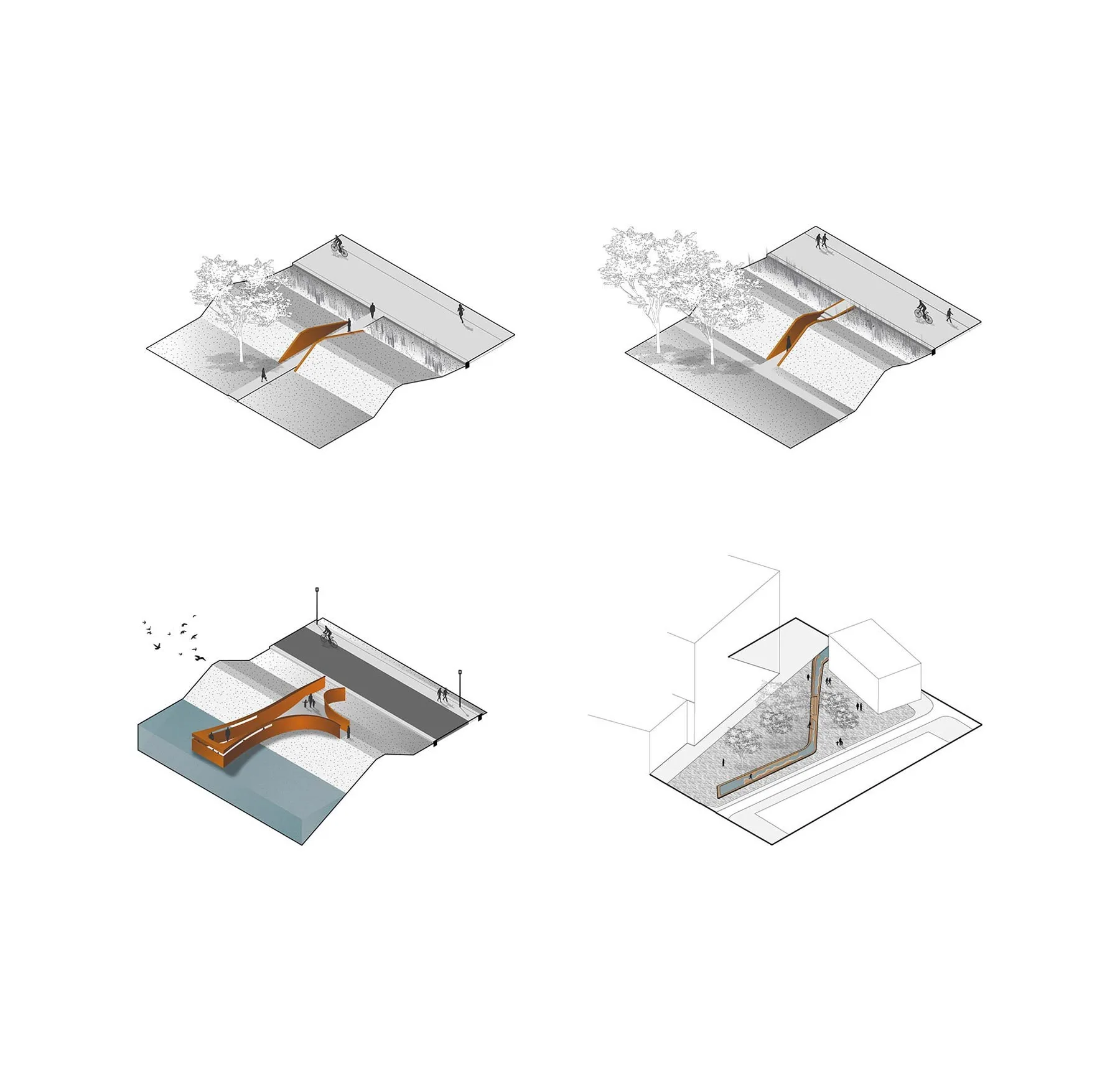 Al deze elementen vormen een krachtige familie van elkaar. Ze worden gemaakt of afgewerkt met een terugkerende detaillering en materialisatie. Deze familie van elementen vormt de basis voor alle andere elementen in het park- en natuurlandschap. Het vogelspothuis, liggend over de dijk en uitkijkend over de waterspiegel van een bassin, de banken, de verstevigingen van de hoeken van de taluds en zelfs de doorgangen door de dijken worden gemaakt met hetzelfde materiaal en dezelfde detaillering.