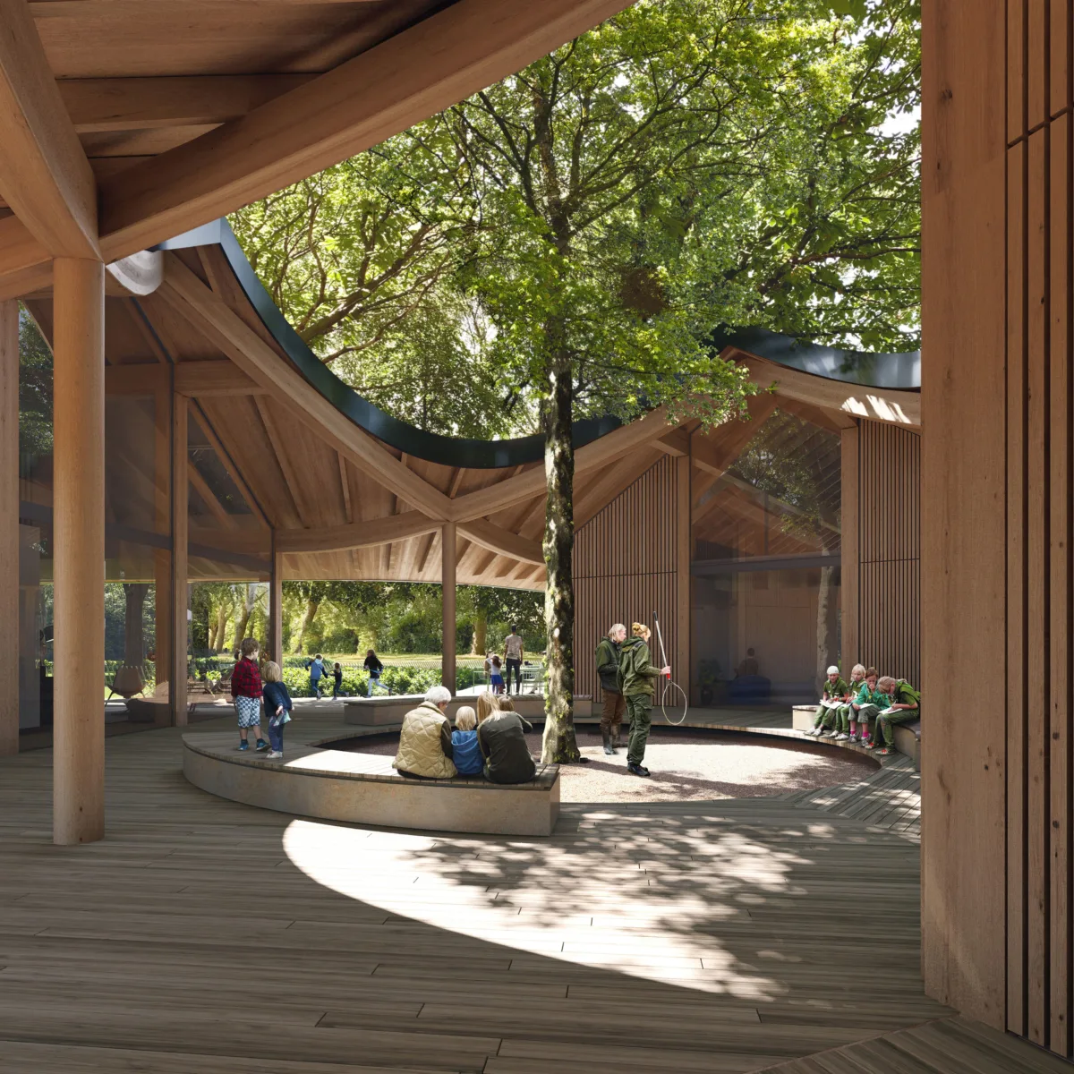 De monumentale bomen van Koekamp zijn leidend in het ontwerp en blijven allemaal behouden. Zij bepaalden de locatie en grootte van het nieuwe bezoekerscentrum. Om te voorkomen dat bomen worden gekapt, nestelt de architectuur zich ertussen. De drie huizen zijn zorgvuldig tussen de boomstammen gepositioneerd, onder een verenigend dak met drie vleugels die samenkomen rond een centrale, cirkelvormige binnenplaats. Deze zal plaats bieden aan een prachtige nieuwe eik. Het resultaat is een ontwerp dat perfect in de natuur is geïntegreerd en er deels door wordt verhuld.