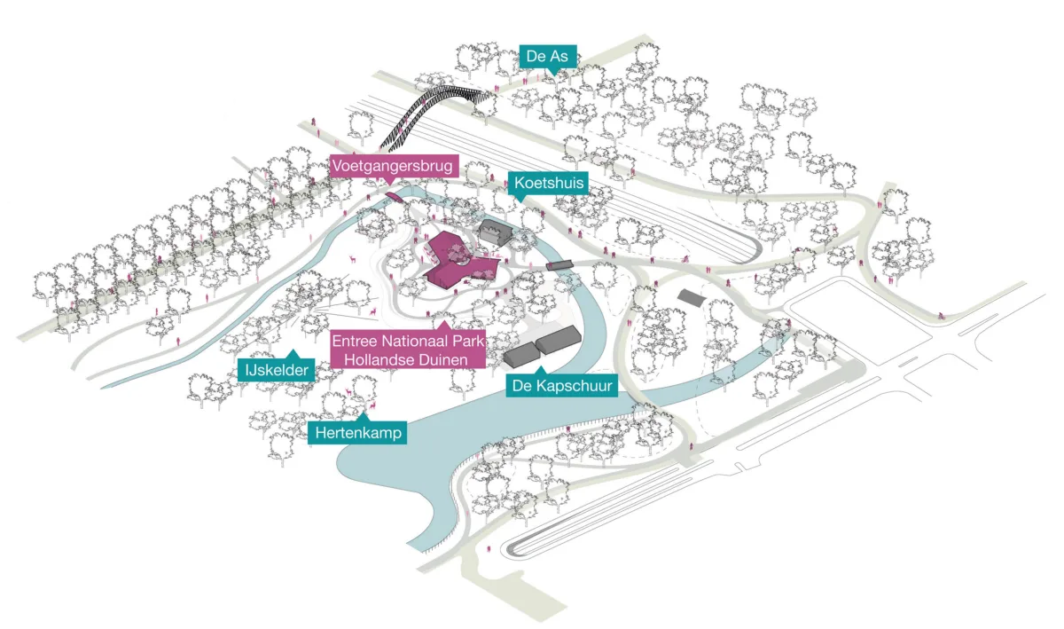 Het bezoekerscentrum en het park, ontworpen in opdracht van Staatsbosbeheer, worden naar verwachting in 2024 opgeleverd.